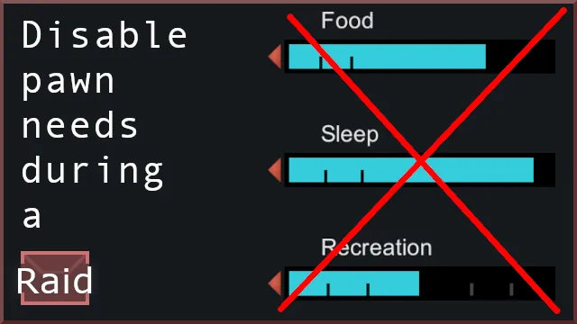 Here's a quality of life mod that automatically disables the decay of needs (food, sleep, recreation) for all pawns during raids. When enemies are present on the map, your pawns needs will be frozen at their current levels. Needs are resumed on raid end.