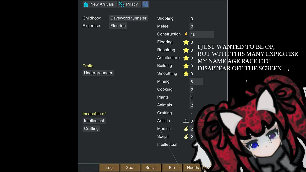 Changes the Bio panel window so if you have multiple expertise there is a collapsible arrow tied to the main skill it's attached to! Now you can go crazy and have every expertise on a single colonist and not worry about the Bio panel scrolling off into oblivion because you couldn't control yourself! Just like me!