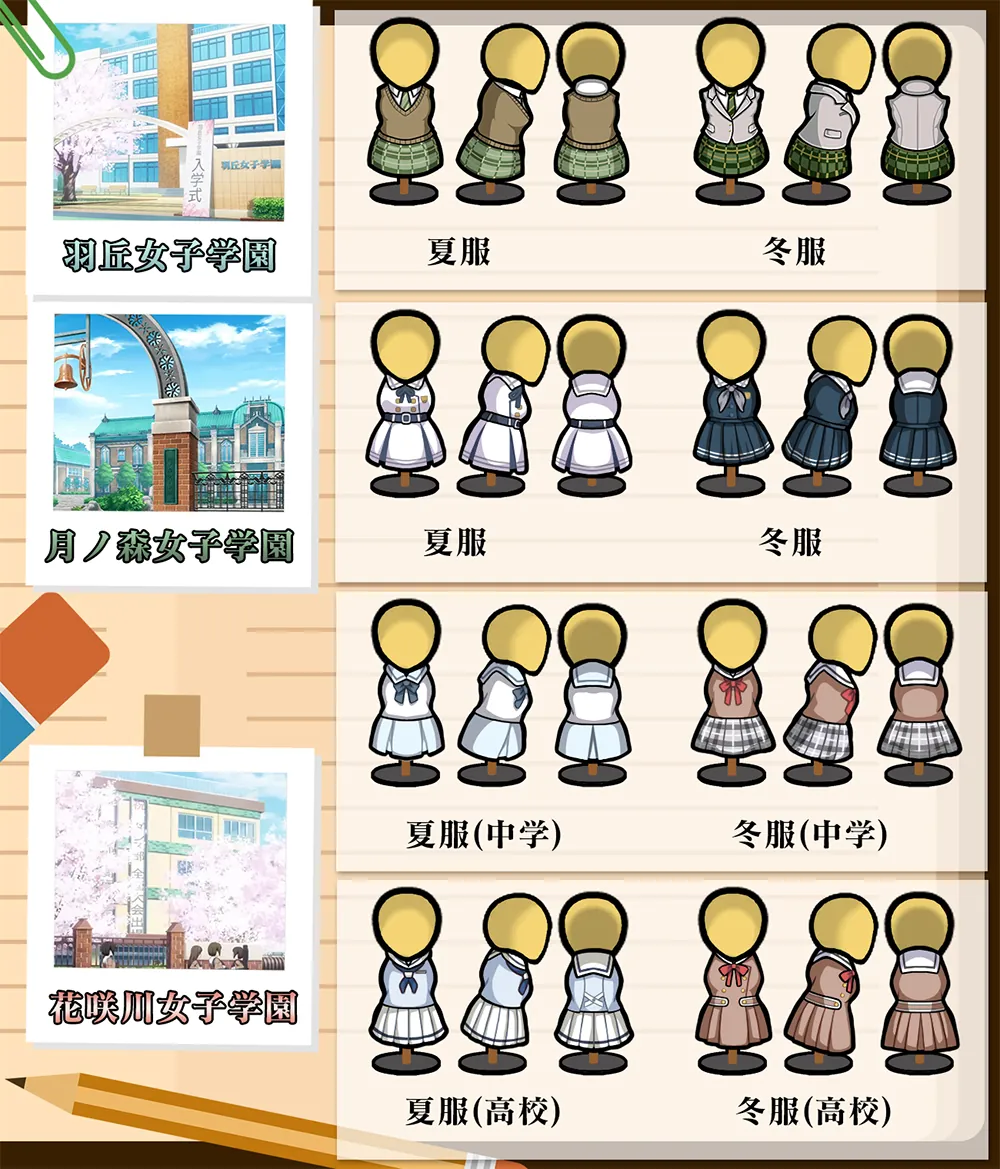 A character apparel and styling package based on the characters from the anime series "MYGO" and "Ave Mujica," which includes corresponding hairstyles and outfits for each character.