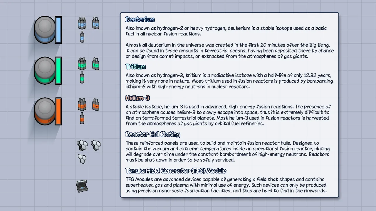 Unlocking [b]Fabrication[/b] and building a [b]Multi-Analyzer[/b] unlocks the [b]Fuel Storage[/b] research project, which leads to additional technologies for the Deuterium Extractor and Tritium Breeder. However, building a MMFS requires a TFG Module, a precision nano-scale device that is only produced by advanced glitterworlds. They can occasionally be obtained from exotic goods traders, factions offering important quests, or from passing Mobile Refinery or Fuel Tanker trade ships.