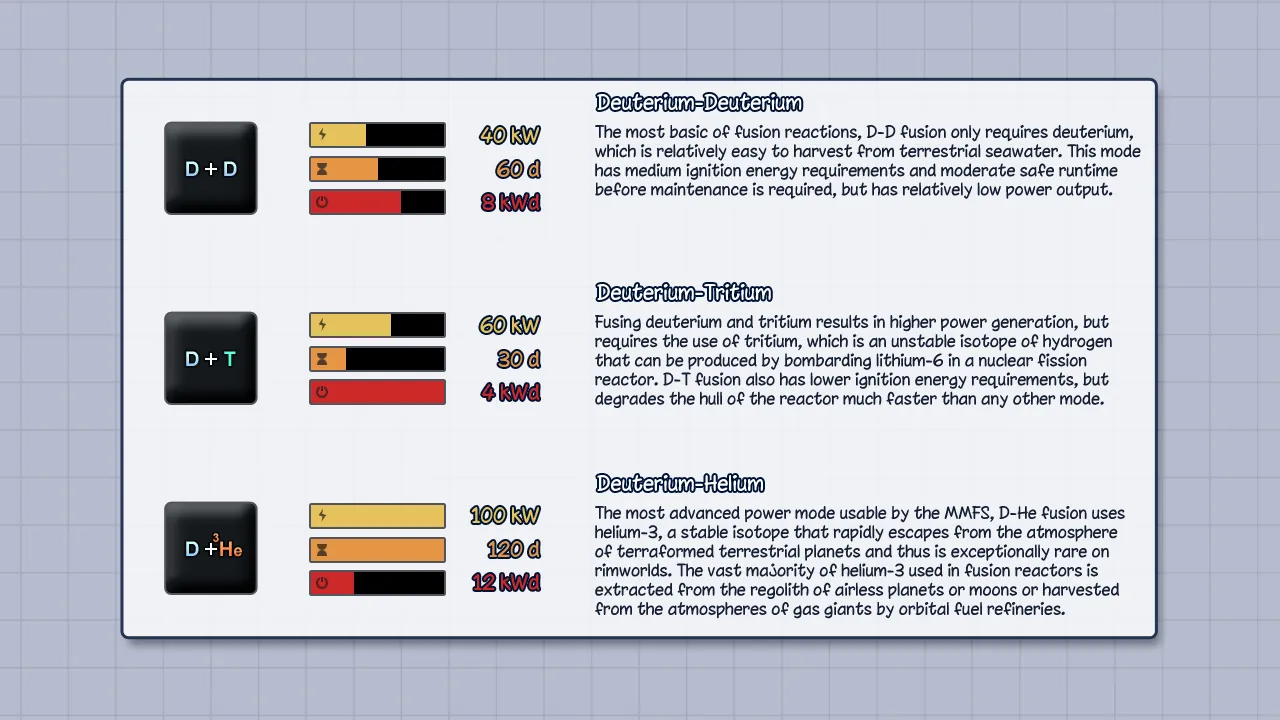 At the heart of Fusion Power is the MMFS, a compact fusion reactor adapted from models used on military starships. Although fusion reactors are considered too inefficient to be used for decades- or centuries-long journeys between the stars, their high energy output is ideal for powering military-grade starship engines, directed-energy weapons, and other interplanetary applications. Furthermore, the MMFS can run in a number of different modes, allowing it to adapt to local fuel availability.