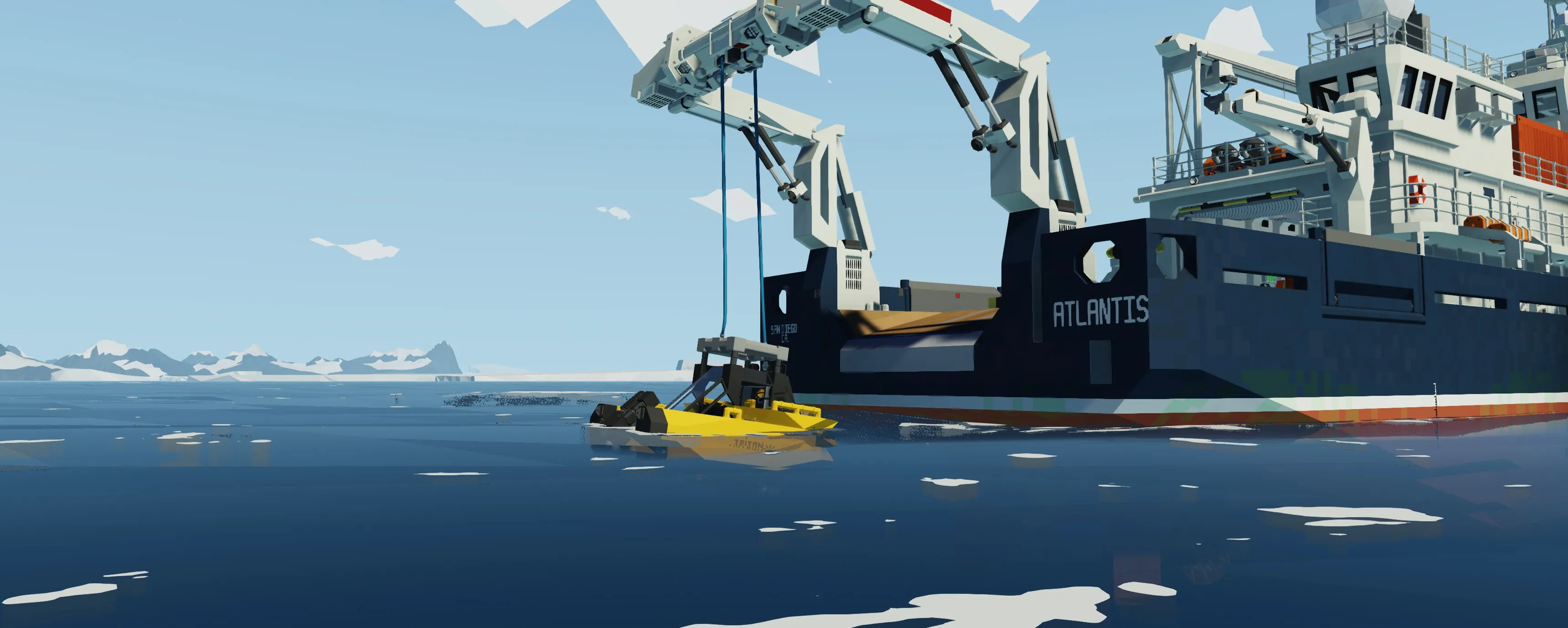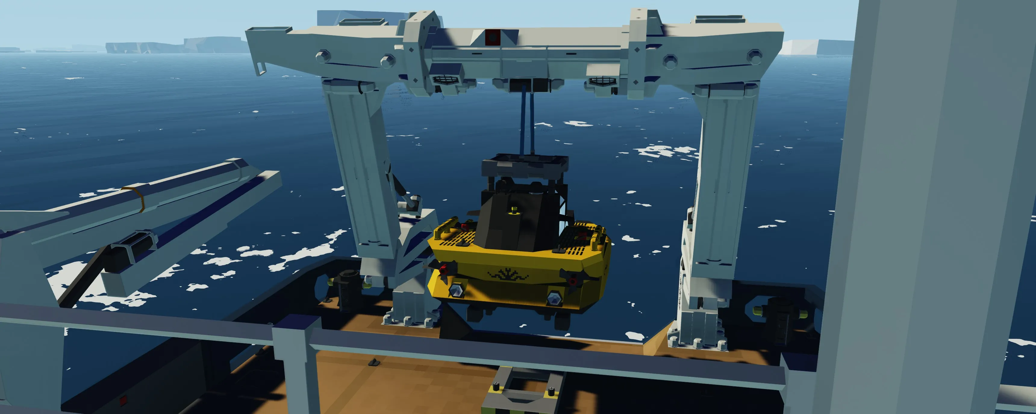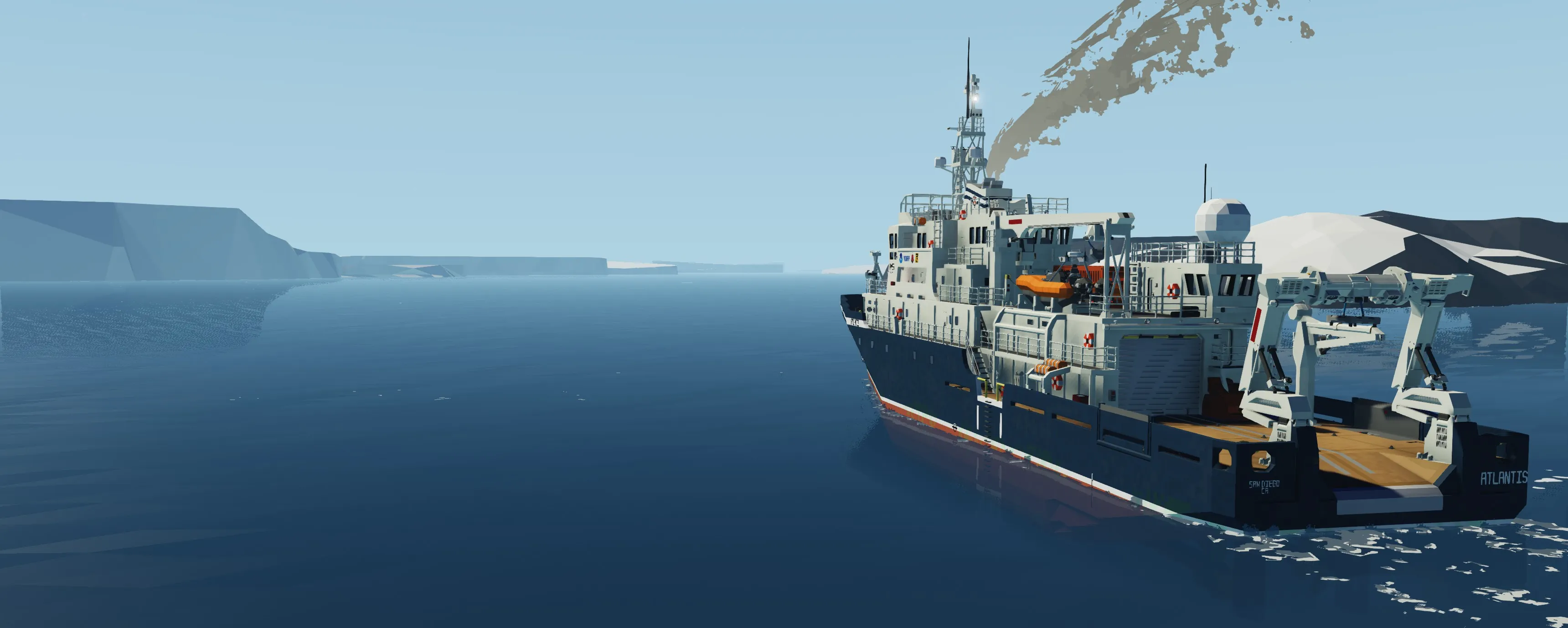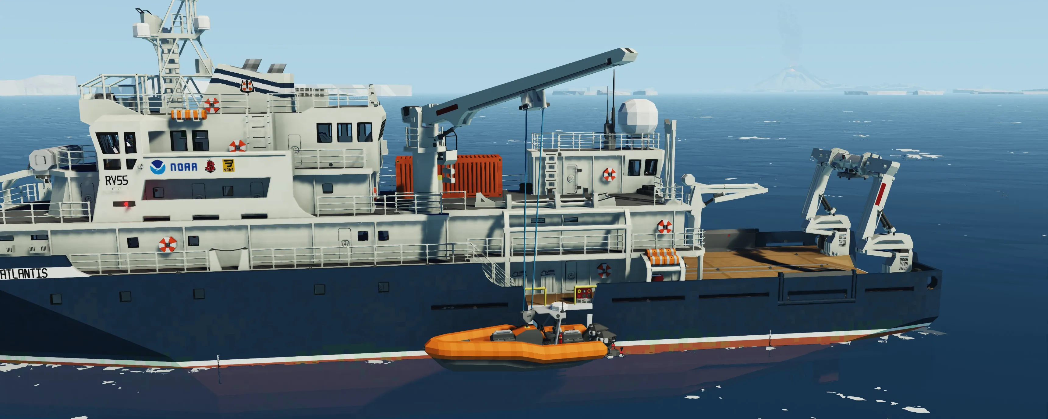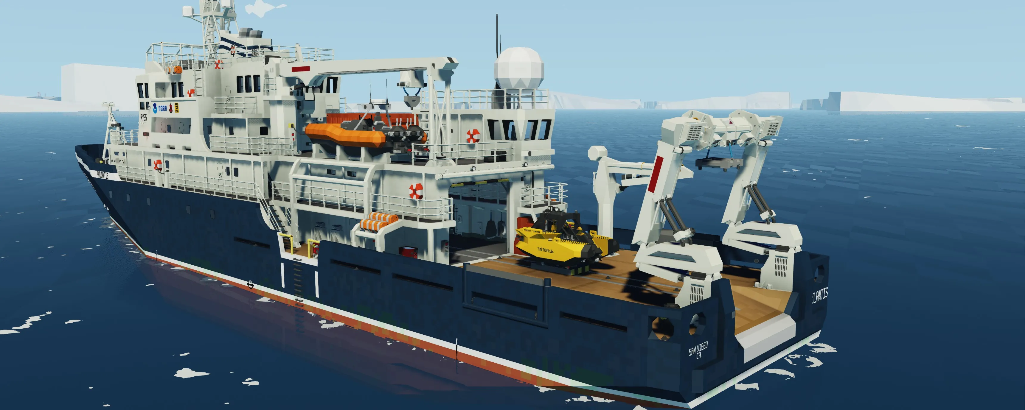 The Atlantis is a highly capable vessel that can weather the toughest of storms with ease. The ships resilience enables it to venture to the most remote of locations to carry out its research. The Atlantis works in partnership with NOAA (National Oceanic and Atmospheric Administration). The vessel is equipped with a large garage that houses a Triton submersible for sub-sea research and exploration (link below). The submersible can easily be deployed and retrieved with the duel hinged A-frame crane installed at the stern of the ship (see instructions for deployment below). The Atlantis also has a RHIB that can be deployed for all sorts of expeditions. The bridge hosts accommodation for the longest of voyages such as a kitchenette and state of the art Garmin MFDs. The Atlantis also has a large laboratory, a workshop, and a workout room.