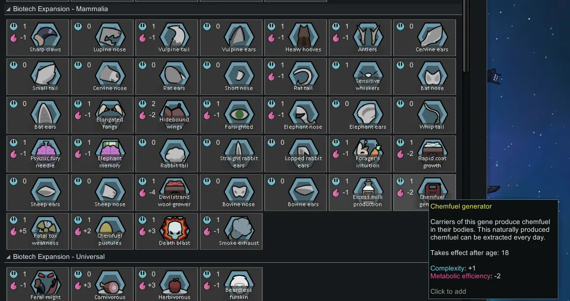 From the creeping wolf to the screeching bat, the Mammalia gene pack implements xenotypes and genes heavily based on terran mammals. Gain fearsome natural weapons, stunning abilities, and plenty of cosmetic options for your own pawns and colonies.