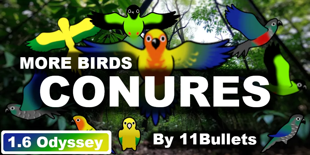 The original inspiration for this mod was Kestrel's wonderful BIRD UP mods, now handled by Tyrannidae - [b][u][url=https://steamcommunity.com/sharedfiles/filedetails/?id=3529981601&searchtext=conure]check it out here[/url][/u][/b].