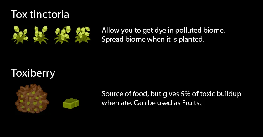 2. toxiberry bush: A berry that expand pollution. You can eat the fruits if you don't care about the toxic buildup it gives you.