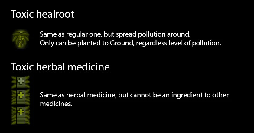 4. toxic herbal heal root: Takes longer than normal, spread pollution, but works as normal herbal medicine.