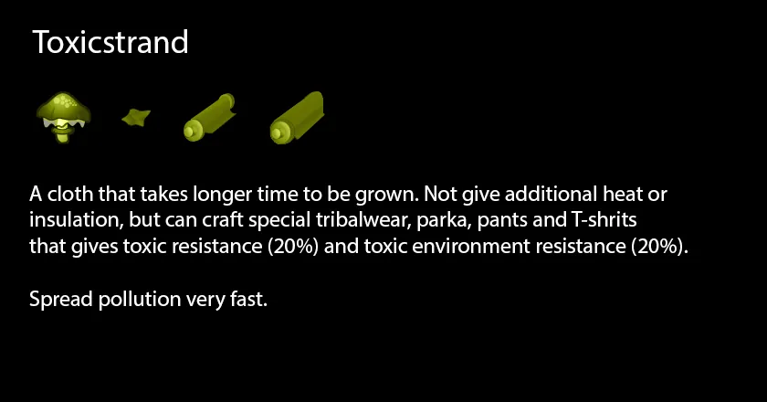 3. toxicstrand: Mutated devilstrand in polluted biome. It won't give you good heat and insulation, but can be used for special tribalwear, parka, duster, pants and t-shrits that provides toxic resistance and toxic environment resistance.