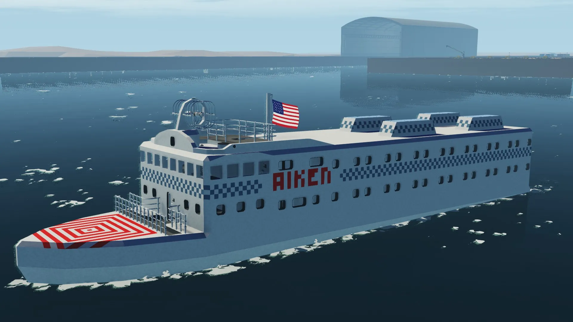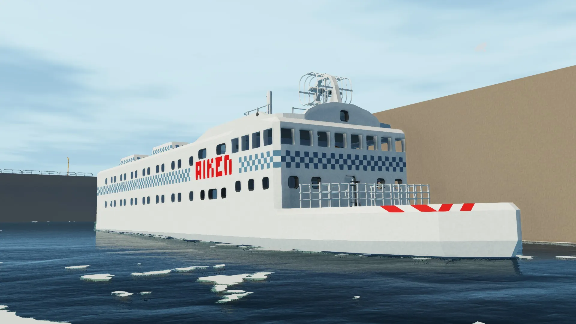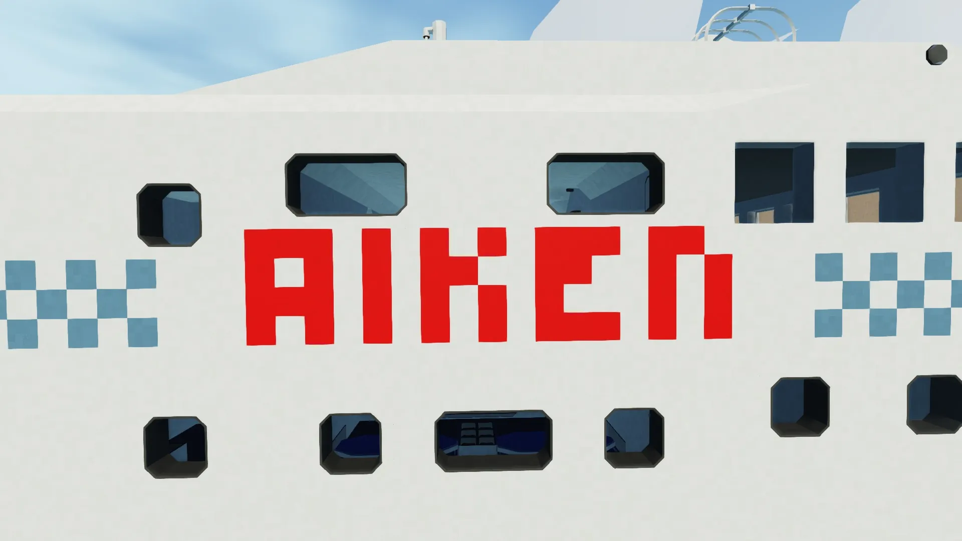 A medium-sized Charterford, using the hull of the Aiken-class multipurpose vessel. It can be used to ferry small passenger charters from one area to another within a short range. It features official Aiken branding, with "AIKEN" in red on the port and starboard superstructure. It also dons a muted blue checkerboard wrapping around it's superstructure and a distinctive high-visibility Bullseye on the bow for safety during emergencies.