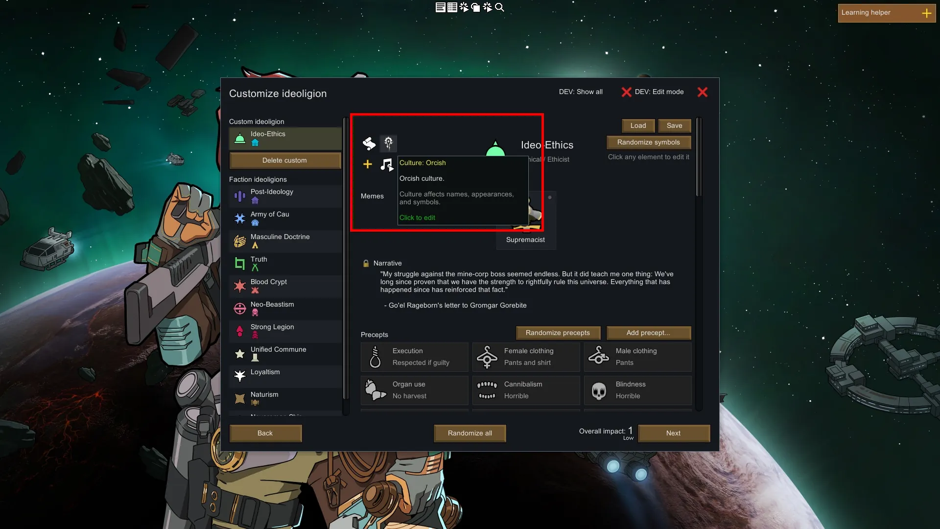 Due to predefined backer pawns, you might still see names like "Trevor Cobb". There's nothing I can personally do, as I have no coding experience to patch those names out from pawn generation when the Orcish culture is used. However, there's about 10000 possible name combinations with this mod, so there'll be plenty of names for the game to take from. Using [url=https://steamcommunity.com/sharedfiles/filedetails/?id=3548290568]Pawn Name Variety[/url] will eliminate all of these predefined back pawns, and will leave your Orcish culture with no Trevor Cobbs (No Trevor Cobbs harmed in this process)!