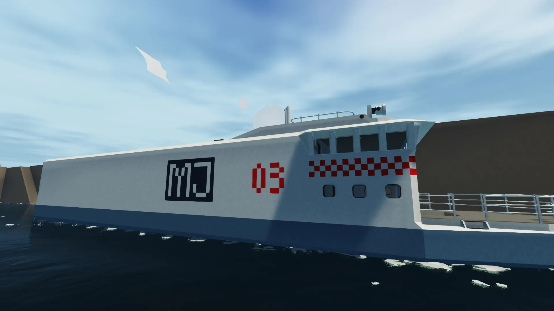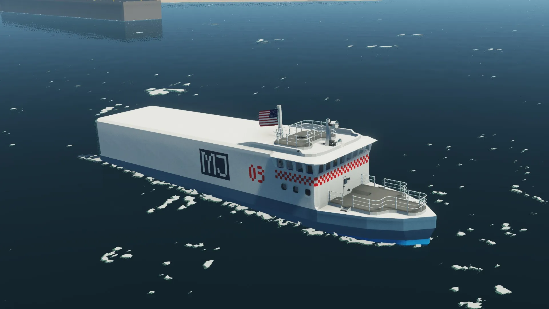 A medium-sized Cargoford, using the hull of the Aiken-class multipurpose vessel. It can be used to ferry medium-small cargo from one area to another within a short range. Being the third vehicle introduced by Major Industries, it bears a large "MJ" ensign on the port and starboard sides, as well as the designation "03".