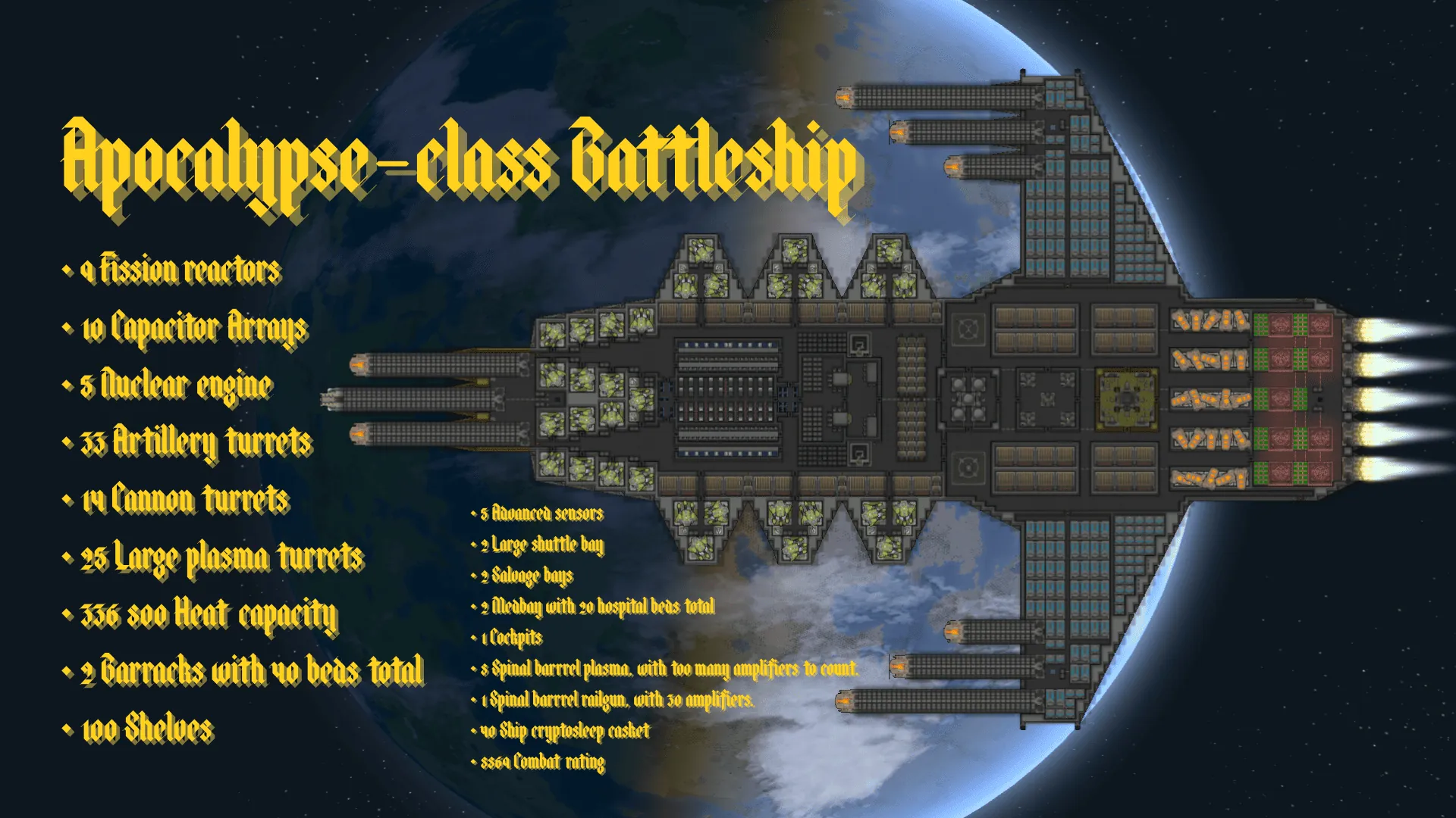 Adds the Apocalypse-class Battleship from Warhammer 40k as an enemy encounter, trade ship encounter, or starting ship in Save Our Ship 2.