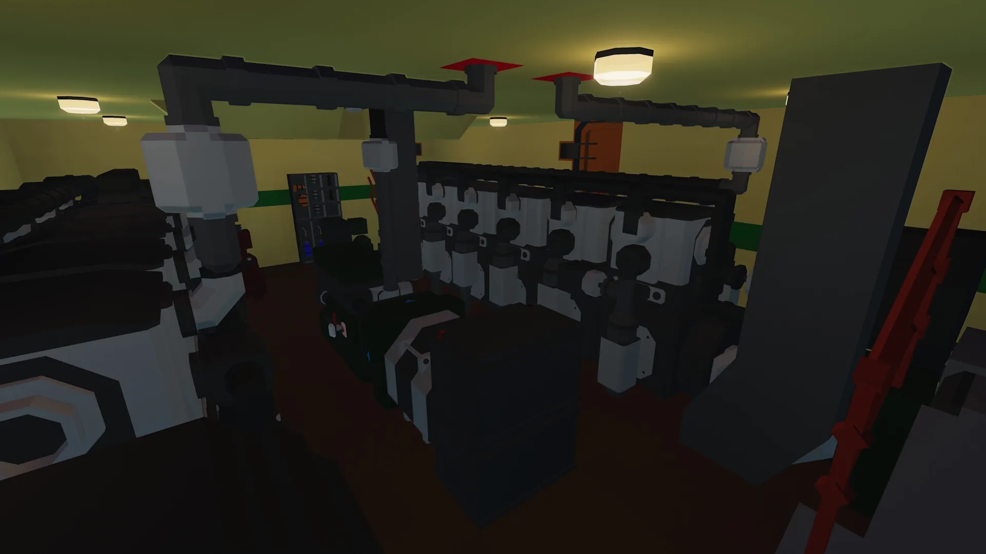 Forward of the engines are two electric pumps – the red fire pump that supplies water to the fire main and hose stations located throughout the ship, and the green bilge pump used for unwatering flooded compartments. They can be both turned on using their respective switches.