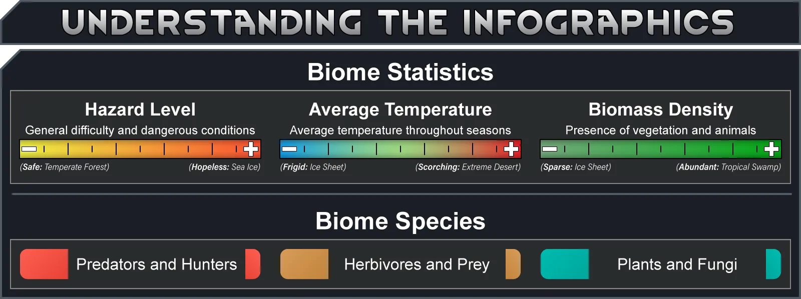 The following infographics will give you a taste of the features present in each biome. You will discover more features as you explore them in-game!
