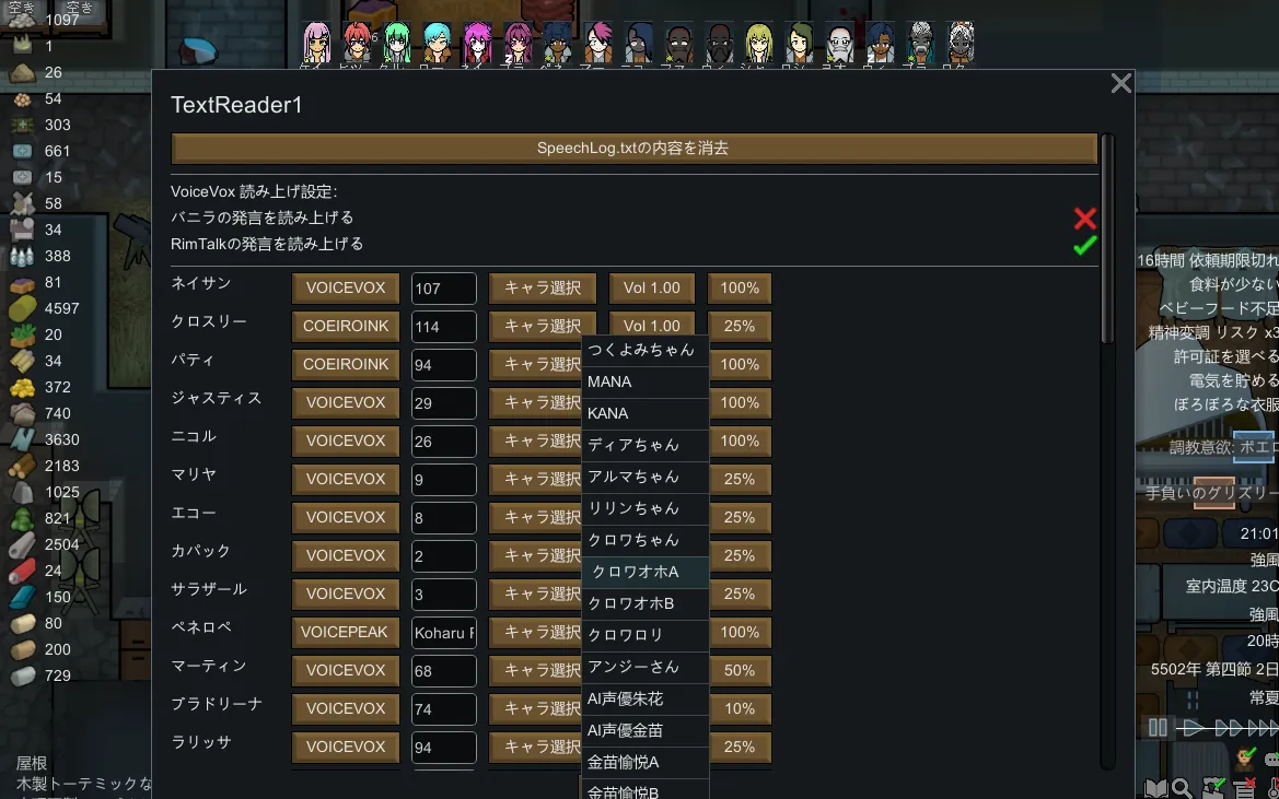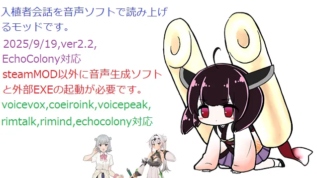 ゲーム中の入植者会話テキストを外部の音声生成ソフトで読み上げさせるモッドです。このsteamモッドの部分はゲーム内UI関連とSpeechLogテキストを記述する動作をします。以下の外部のやつが必要です。