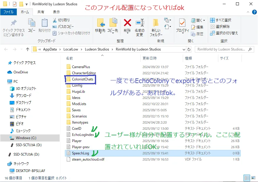 2.一度でもEchoColonyで「exportボタン」を押すとプレイヤーログと同じ場所に「ColonistChats」フォルダが追加されます。