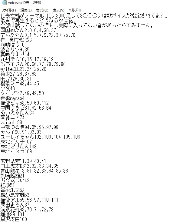 VoicevoxSpeakerIDはその人が何の声で喋るかです。ずんだもんあまあまが1、四国めたん通常が2、小春六花(Voicepeakのキャラの所持が必要)はKoharu Rikkaなどです。各キャラ通常ボイスや一部特徴的なボイスを選べます。他のボイスは数字を入力してください。