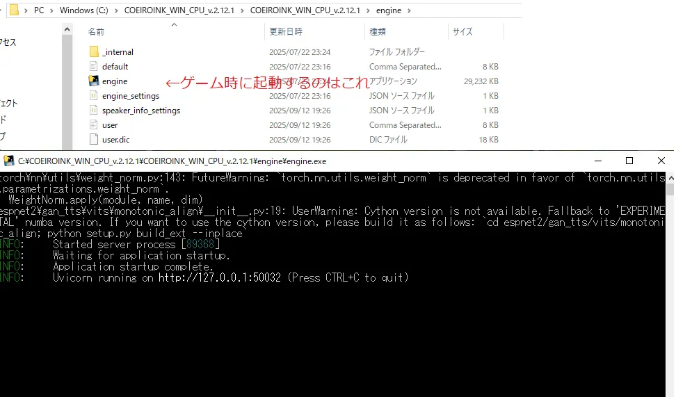 2,COEIROINKエンジンを起動する。エンジンは本体からファイルのある場所→engineフォルダのengineEXEを起動。