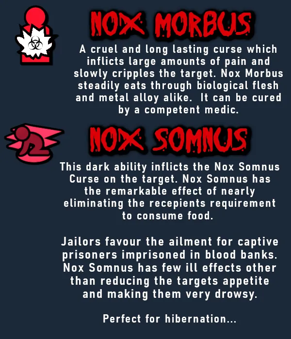 This dark ability inflicts the Nox Somnus Curse on the target. Nox Somnus has the remarkable effect of nearly eliminating the recepients requirement to consume food, making it a common ailment for captive prisoners in blood banks. Nox Somnus has few ill effects other than reducing the targets appetite and making them very drowzy.