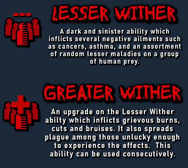 An upgrade on the Lesser Wither abilty which inflicts grievous burns, cuts and bruises. It also spreads plague among those unlucky enough to experience the effects. This ability can be used consecutively.