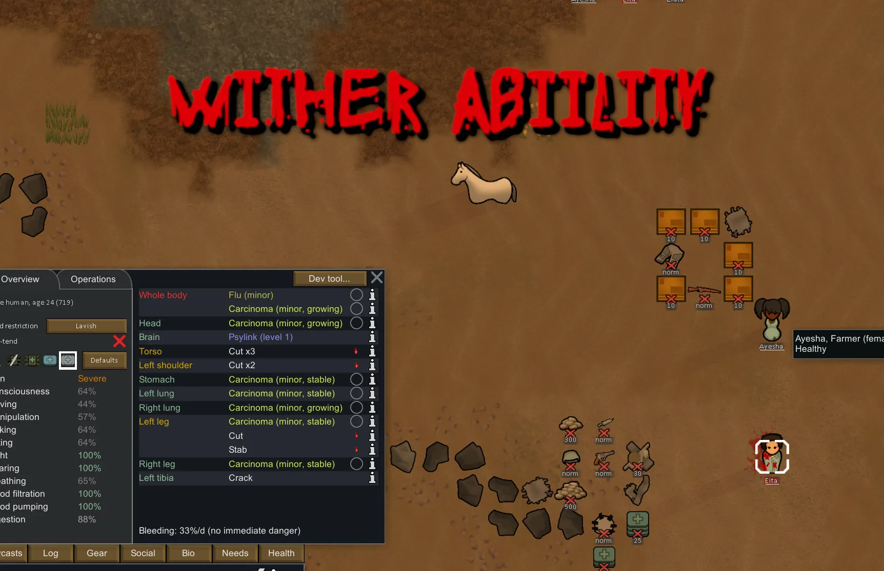 A dark and cruel ability which causes the target pawn or animal to suddenly have an artery blockage. This does not work on mechanoids obviously. Future updates to this ability are pending.