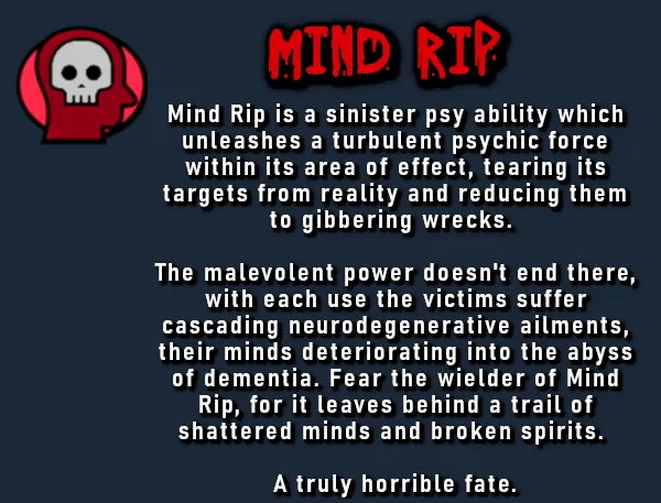 Another dark and sinister ability which causes the target to suddenly be afflicted with dementia. The effects will be updated soon.