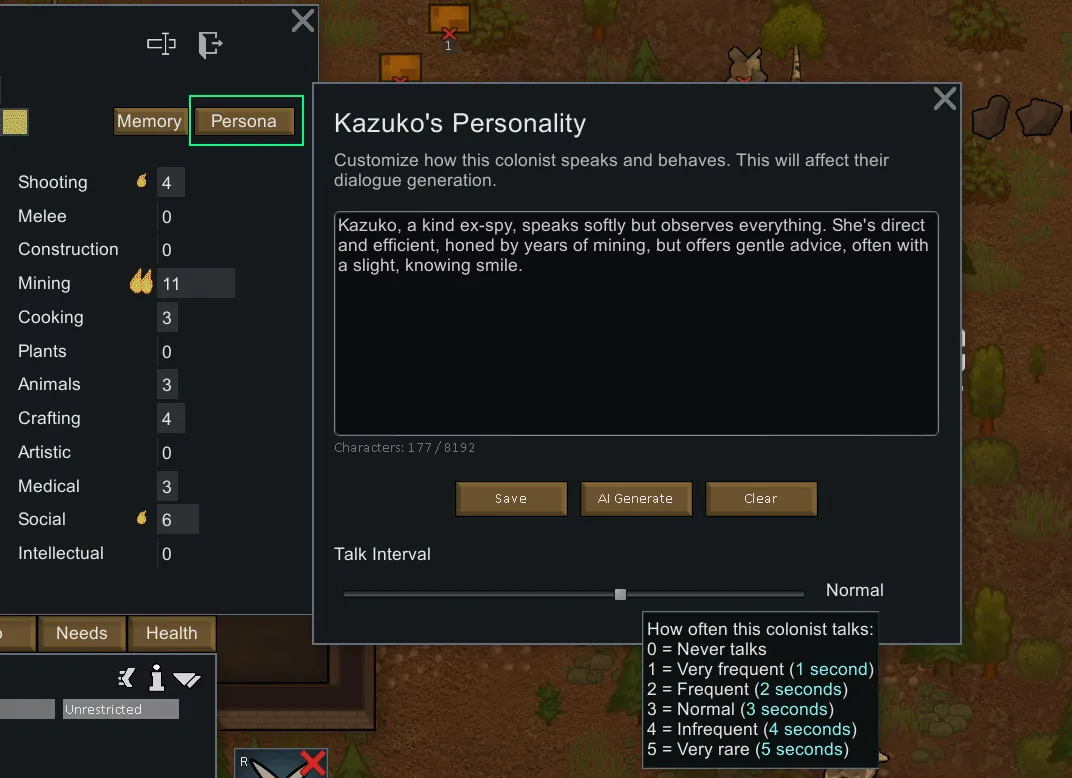 [b]AI Persona Generation:[/b] The mod can automatically generate a suitable personality based on a pawn's stats, background, and traits.
