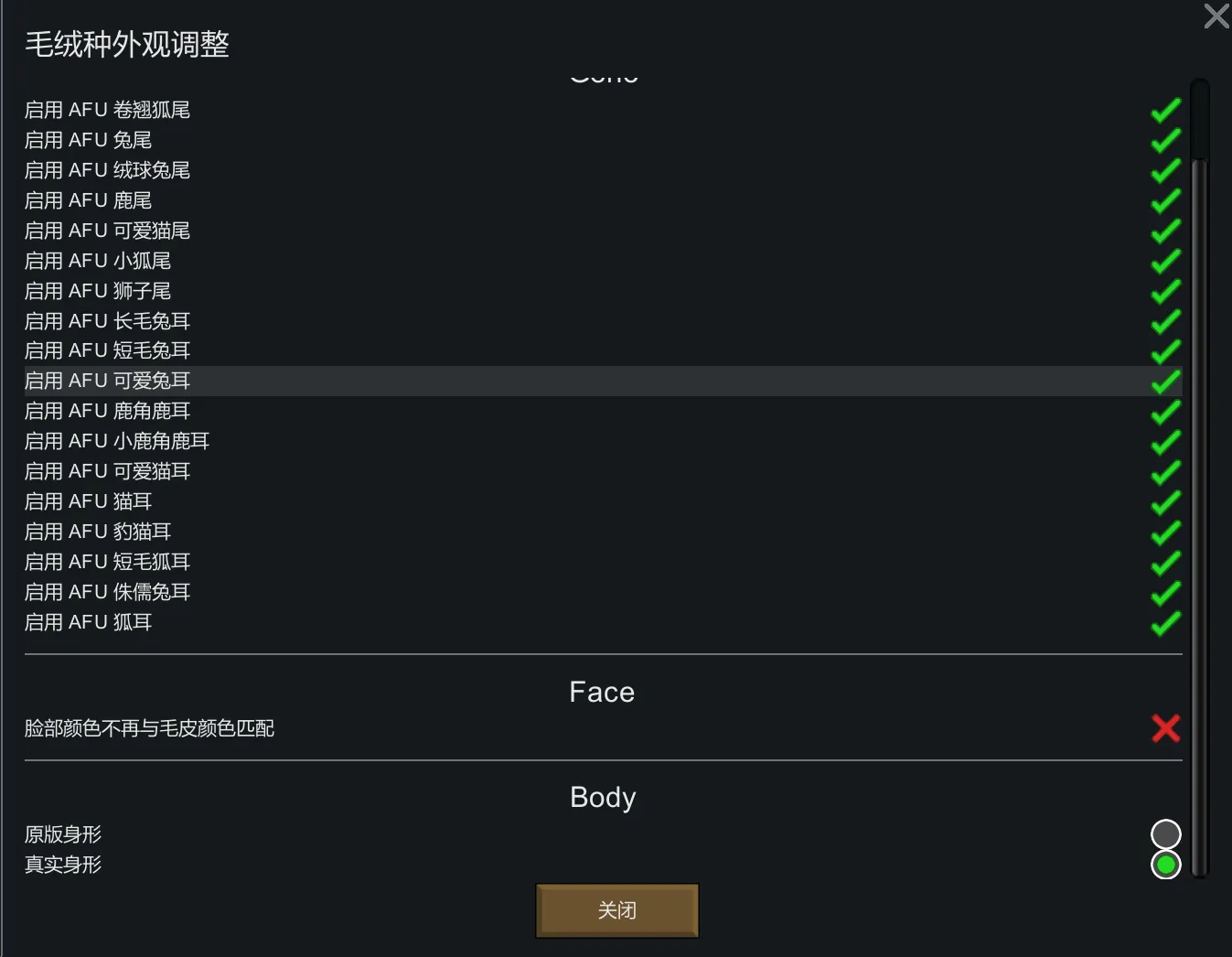 4.(Need [url=https://steamcommunity.com/sharedfiles/filedetails/?id=2574315206]XML Extensions[/url], all cosmetic genes will be added by default.)You can check off preferred AFU cosmetic genes via the mod settings and choose whether the face color matches the furskin color(The colors match by default, [url=https://steamcommunity.com/sharedfiles/filedetails/?id=3395245922]Cannot use with separate patch version[/url])