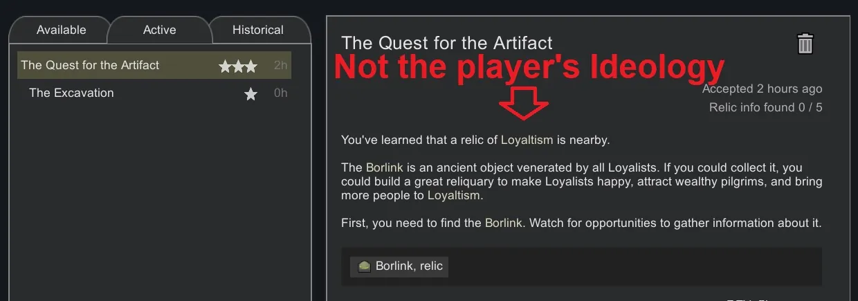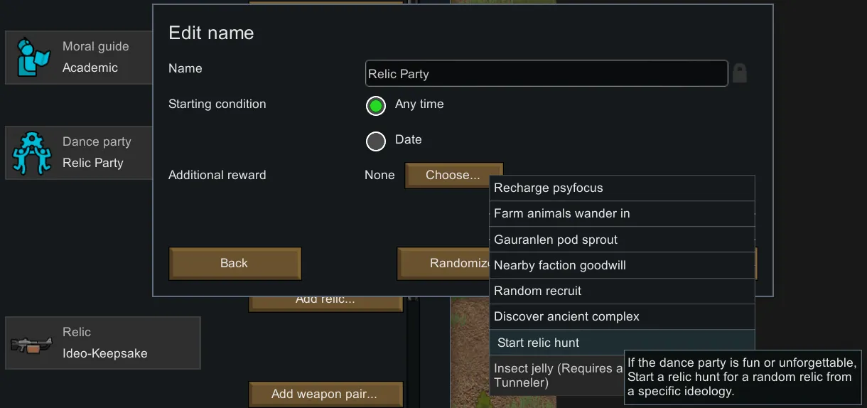 Adds a Relic Hunting ritual reward for hunting down other Ideology's Relics, or your own. You can even specify which relic you want to quest for, or leave it on random by default on the ritual screen.