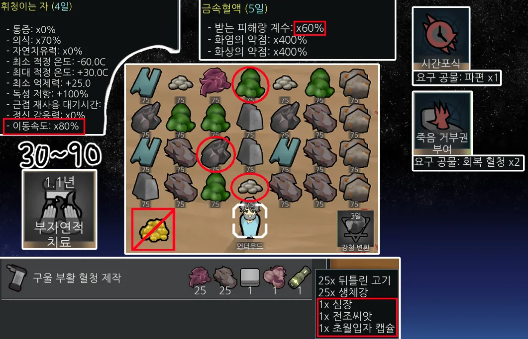 구울 부활 혈청 : 요구 재료 생체강 20개, 뒤틀린 고기 20개 -> 생체강 25개, 뒤틀린 고기 25개, 심장 1개, 전조나무 씨앗 1개