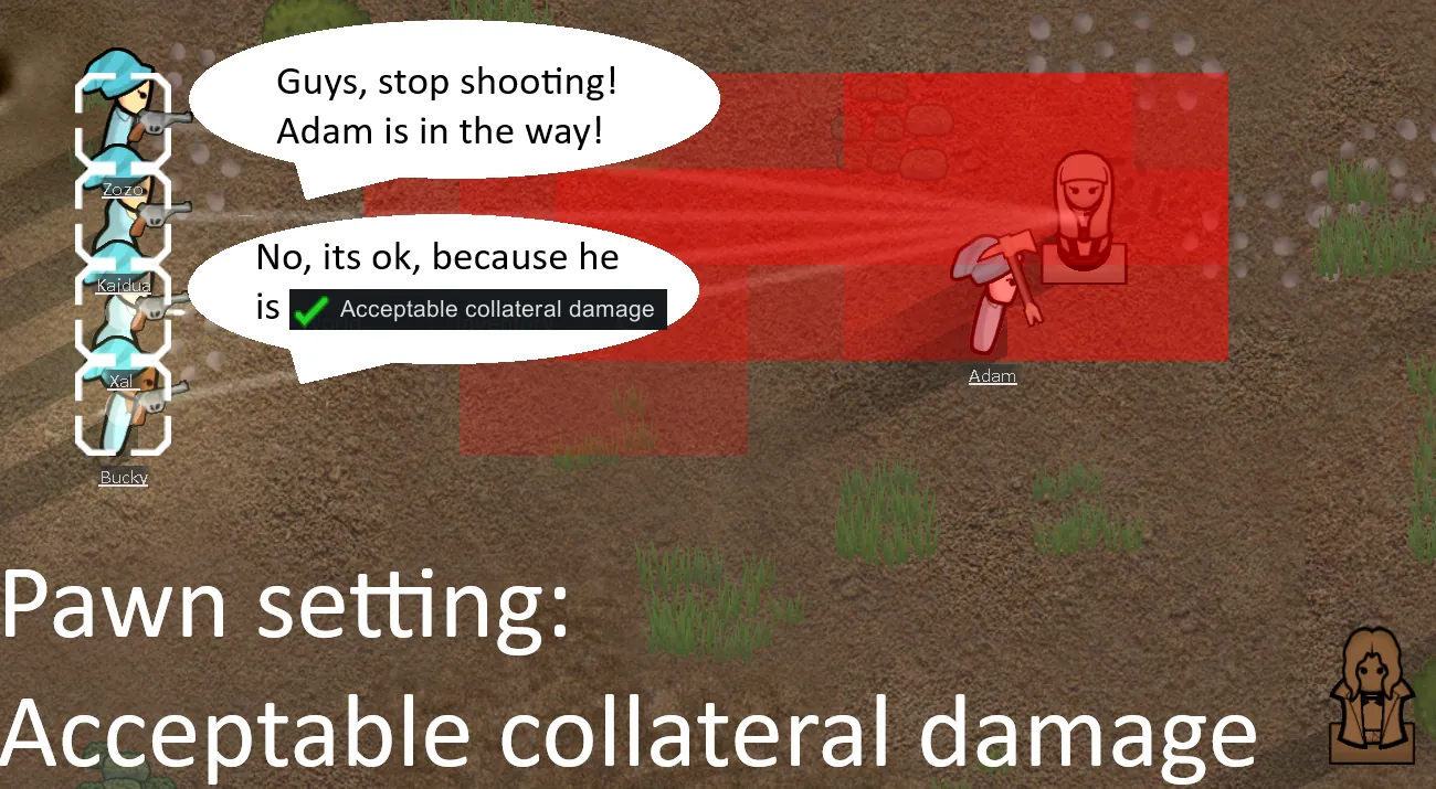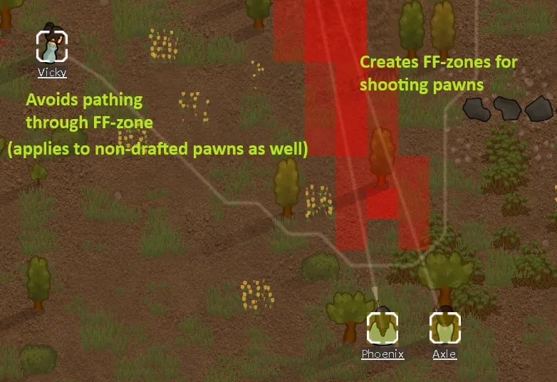 [*] [b]Allow shooting near melee-attacked friends[/b]: If a pawn gets targeted by a nearby hostile using melee-attacks, allow AI-controlled pawns to take risky shots to help. Will show an "Allow FF" text on a pawn when this is activated. (Off by default)