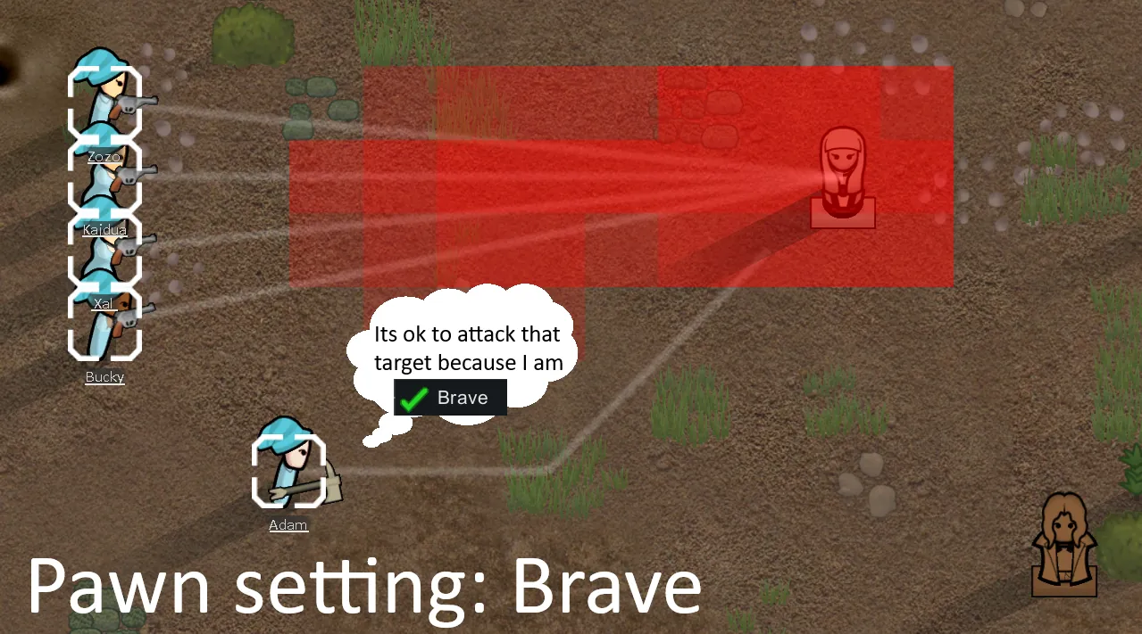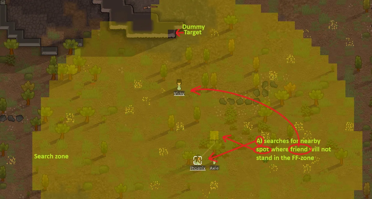 [*] 4. If the best position found IS the current position, the pawn will choose a target to shoot. It checks every hostile in range to find the one it has the highest accuracy against, while also not risking friendly fire. If no target is acceptable, the pawn regroups.