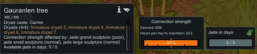 The gauranlen tree now has a supply of jade. Each day, the tree will use up the jade to halve the dryad spawn timer. 20 jade is worth one day.