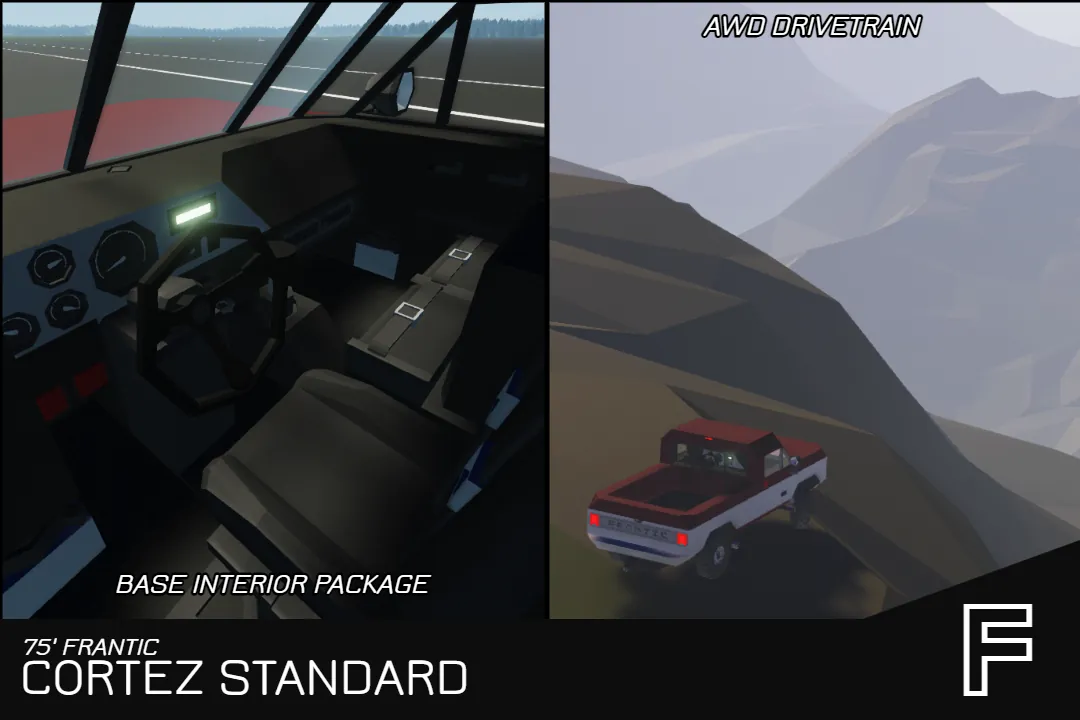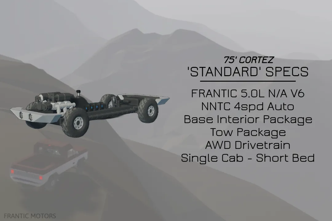 The CORTEZ STANDARD is a mid powered single cab short bed pickup truck.