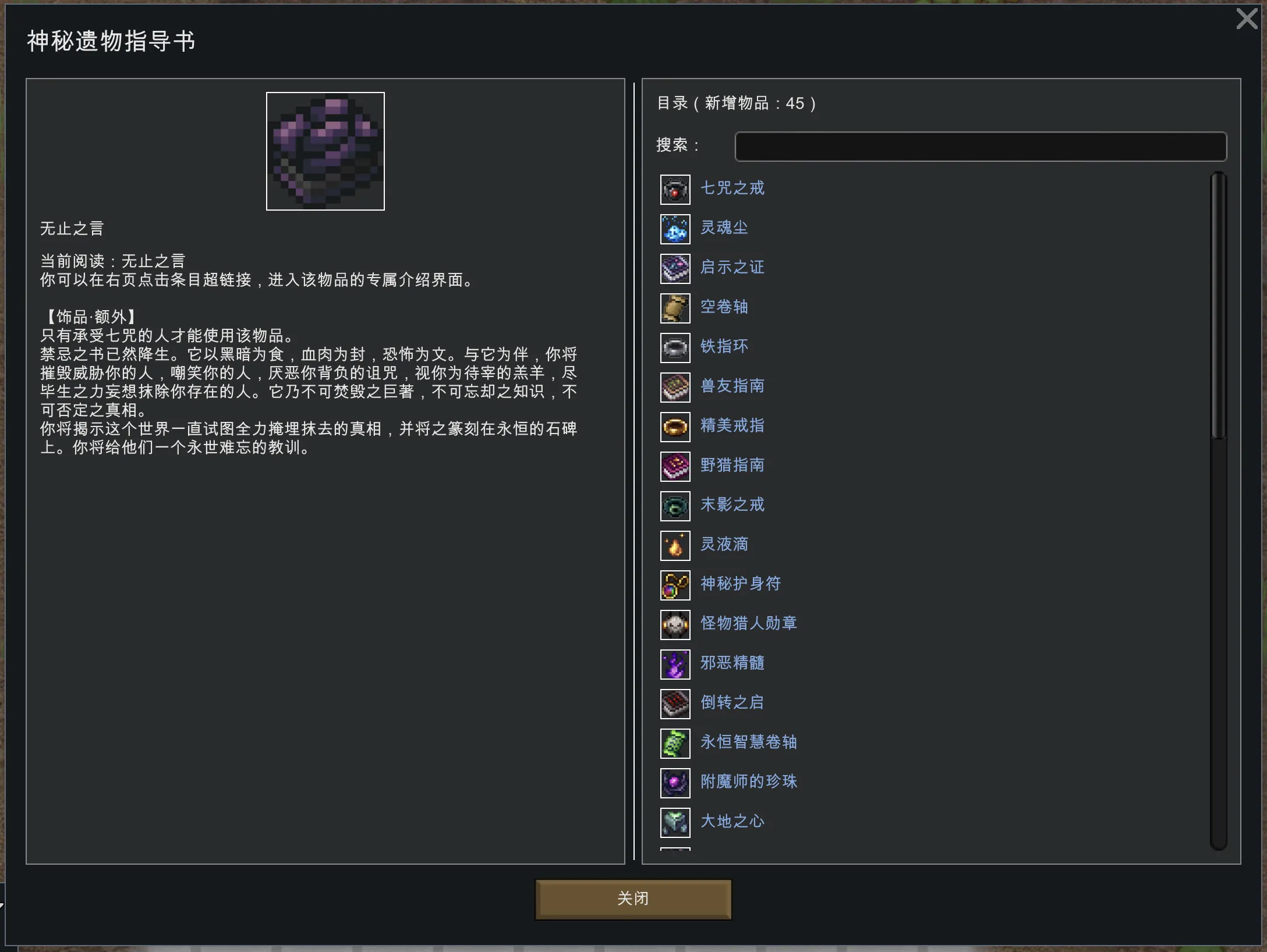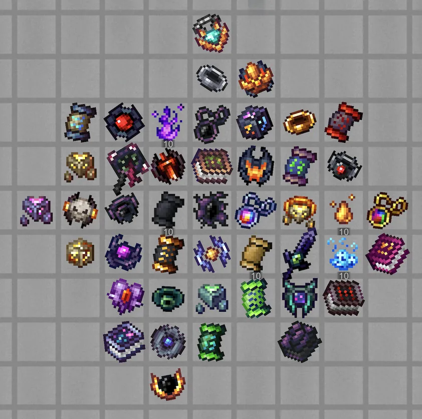Upon starting a game, a guide book called "The Acknowledgment" will spawn in the center of the map to help you understand the various accessories and mechanics of this mod.