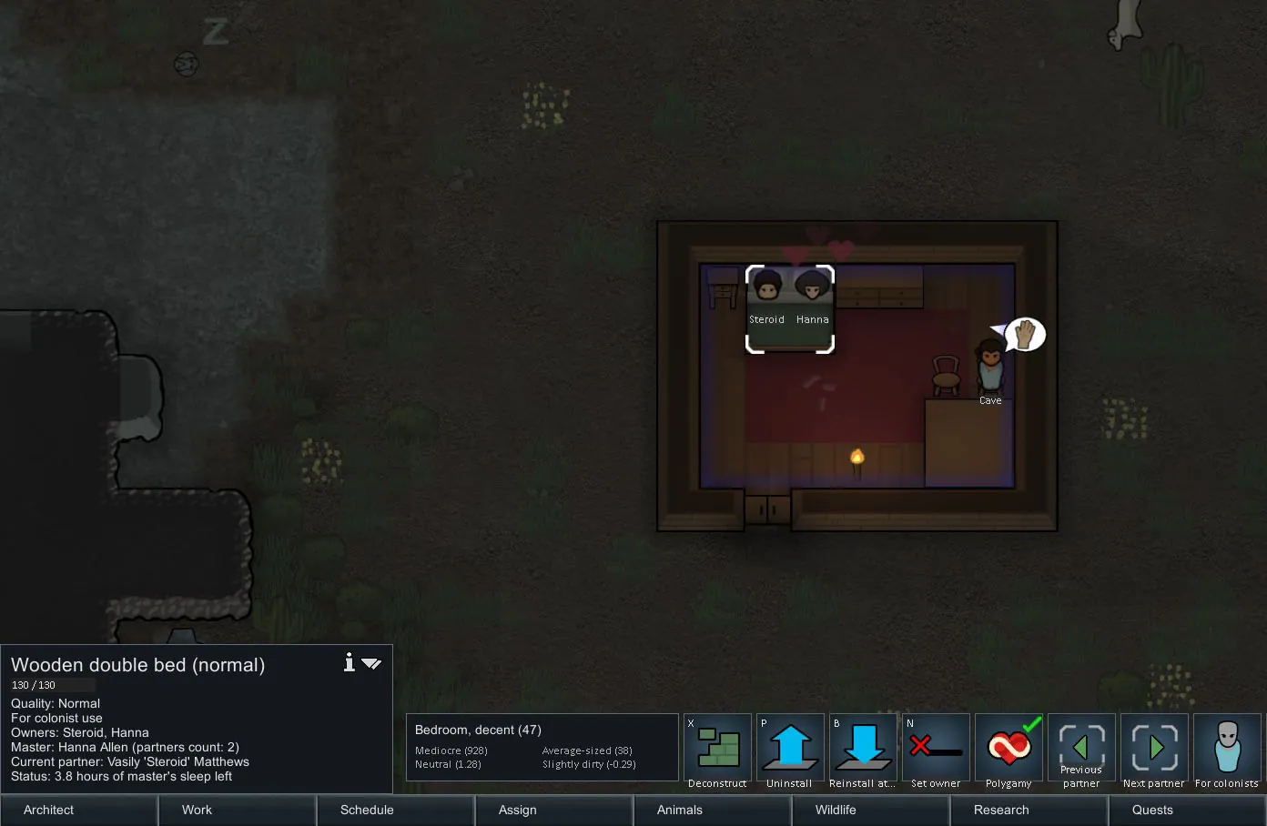 Let your pawns enjoy a real harem! Now you can turn on a polygamy mode for double beds. On this bed, you can assign only one colonist who will be called a master. But all other colonists, who are in a loving relationship with them, will line up and take turns spending sleep time with a master. The rest of the time they sleep in their own separate bed. Conditions for partners changing: