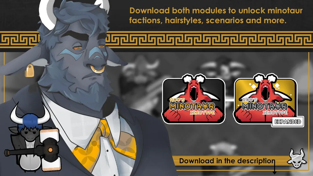 Included in the core version of Roo’s Minotaur Xenotype are six bovine tattoos and a selection of minotaur-crossbreed xenotype icons for your own custom xenos. For more cosmetics, like hairstyles and clothes, check out in [url=https://steamcommunity.com/sharedfiles/filedetails/?id=2927815286]Roo’s Minotaur Xenotype Expanded[/url].