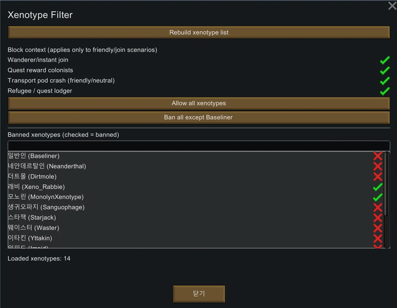 Known issue: When Baseliners are blocked, the filter may fail to properly exclude blocklisted xenotypes in pawn-join events other than hospitality_Refugee. We’re working to resolve this.