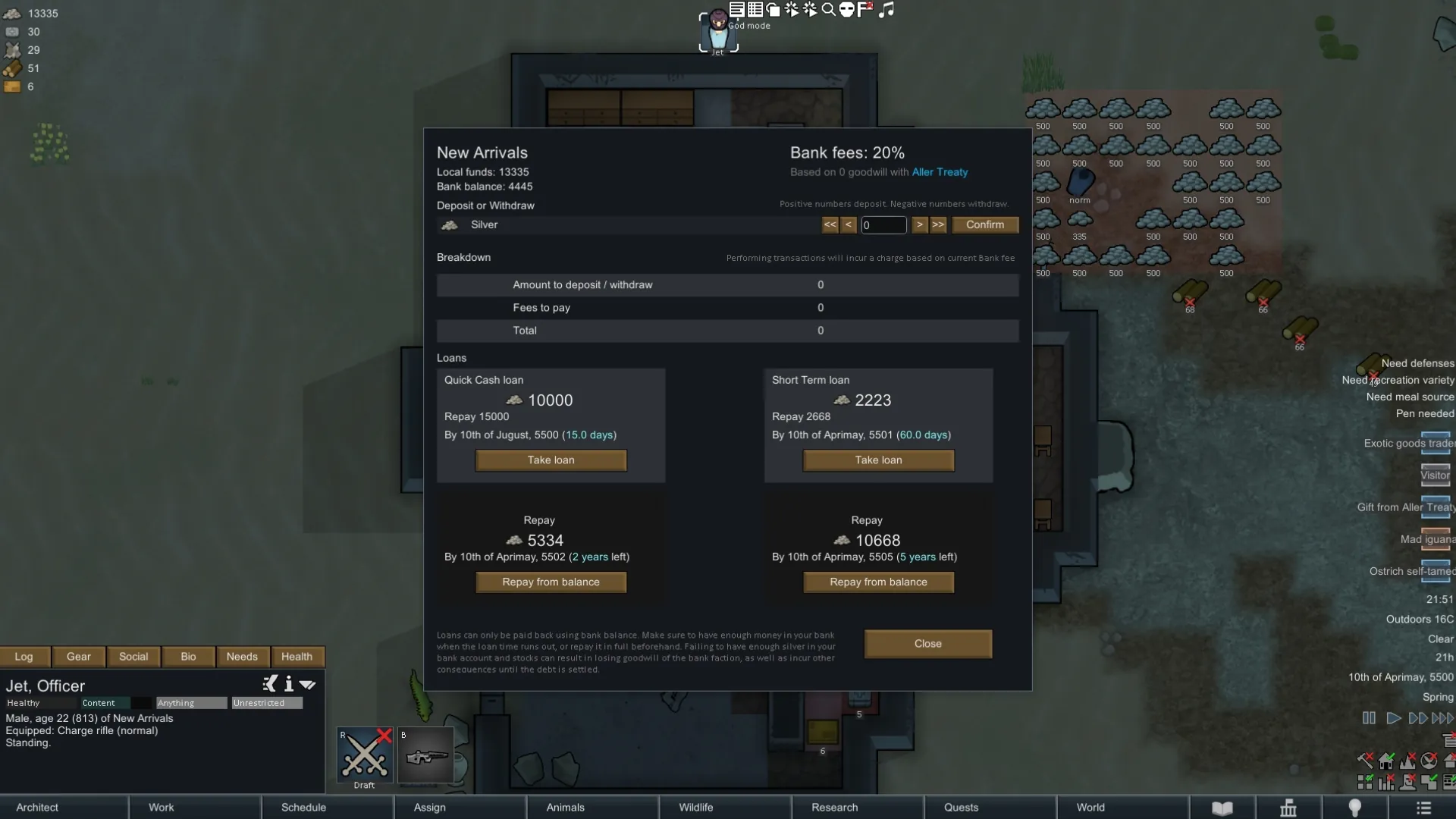 You can now put your hard earned cash in a safe place - the bank. There are two banks right now, a Civil Outlander one, and an Imperial one if you have Royalty DLC. It’s possible for modders to add more banks. Putting money in the bank costs you a percentage - and so does pulling your money out, so don’t abuse the bank too much. The fee depends on your relations to that faction - if you’re allies, there is no fee at all! Good thing about the bank is that the silver no longer counts towards your colony wealth - so if you’re getting raids of enormous size, perhaps deposit some money!