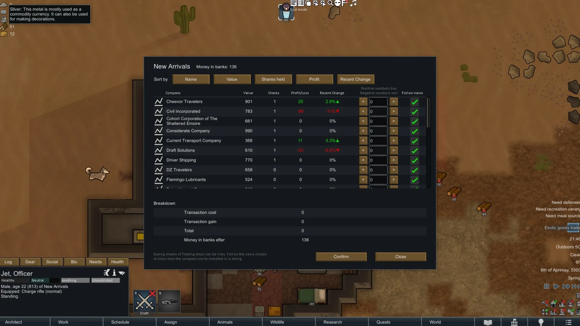 You can now put your money in various randomly generated Orbital trade companies. They start with random prices. Overtime, you will notice news regarding the companies - and you will see how they affect the prices of shares. If you see your company releasing astounding earning reports, or investing in new ships to expand the business, make sure to snatch more shares before they go up, to sell at the peak. Shares you own don’t count towards your wealth, so noone will raid you for your portfolio.