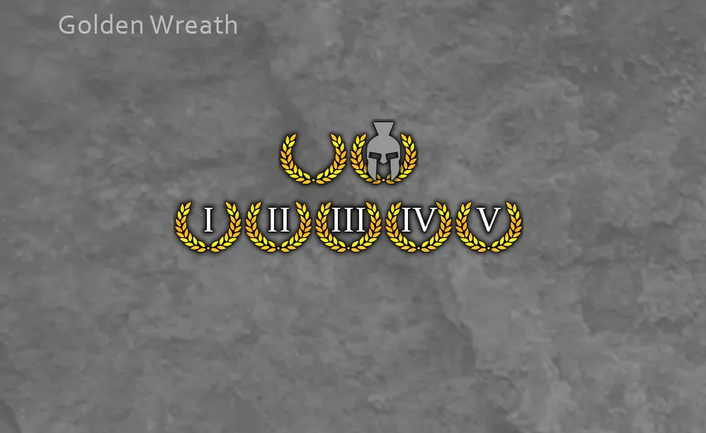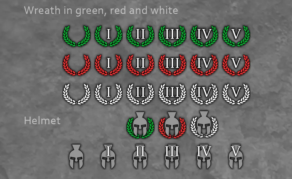 Roman numeral badges, 1 - 15 in several colors plus some helmet and wreath badges.