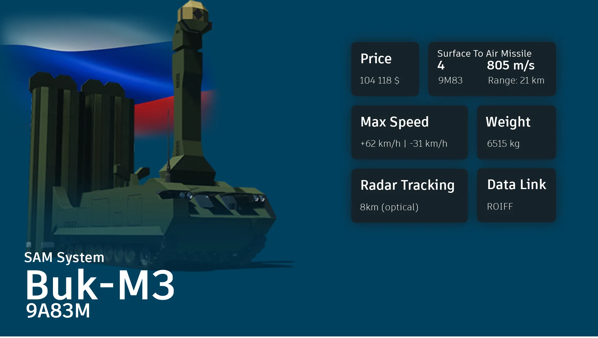 In game, the 9A83M is a [b]Long Range Surface to Air Missile[/b], sitting above Buk-M3 in the air-defence hierarchy. It is armed with 4 heavy missiles fitting Impact fuses (small warhead) and Proxy fuse (medium warhead), being the only missiles in the Buk-M3 Battalion capable of shooting down other missiles. It also features two modes of launch depending on how close the target is.