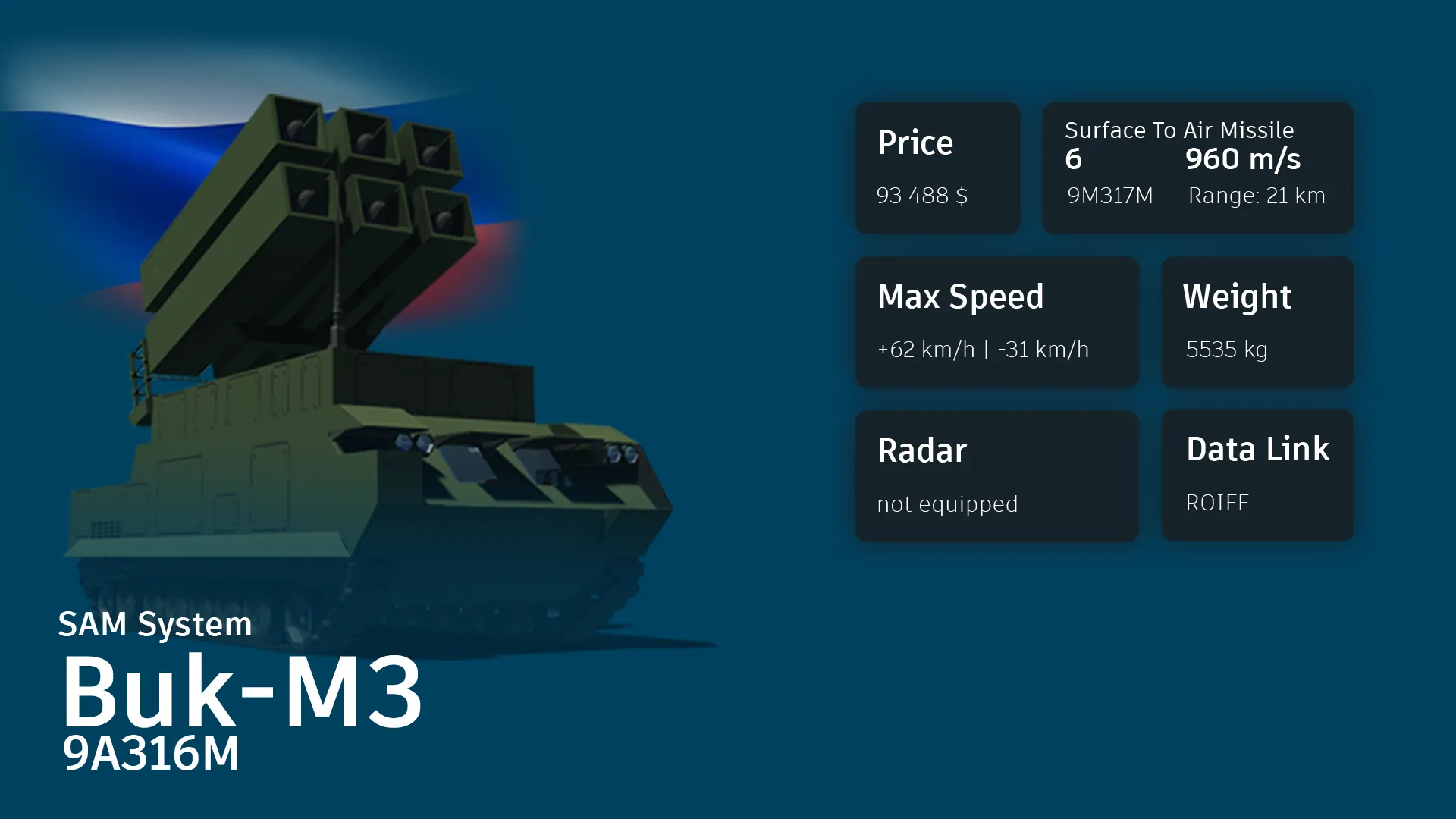 In game, the 9A316M is a [b]Medium Range Surface to Air Missile[/b] of the Buk-M3 family. Unlike its real counterpart, the number of missiles carried is 6, to fit the dimension requirements to fot inside train workbench. The main feature of the vehicle is that it does not have its own engagement radar relying on other vehicles within the Battalion Datalink for target firing data. You can still give it a GPS coordinate as manual targeting.