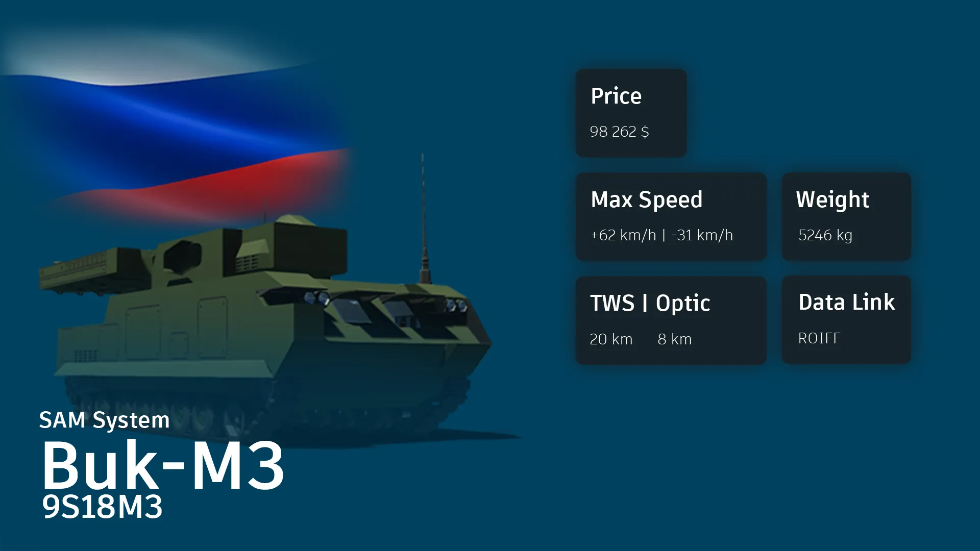 In game, the 9S18M3 is a [b]Target Acquisition Radar[/b] of the Buk-M3 battalion. It is the second most capable radar system of the Buk-M3 family as it's capable of up to 20 km Search and Track. There are two disadvantages being the slow update rate of the targets which cannot perform great on closer distances and a manual pitch control of the radar beam.