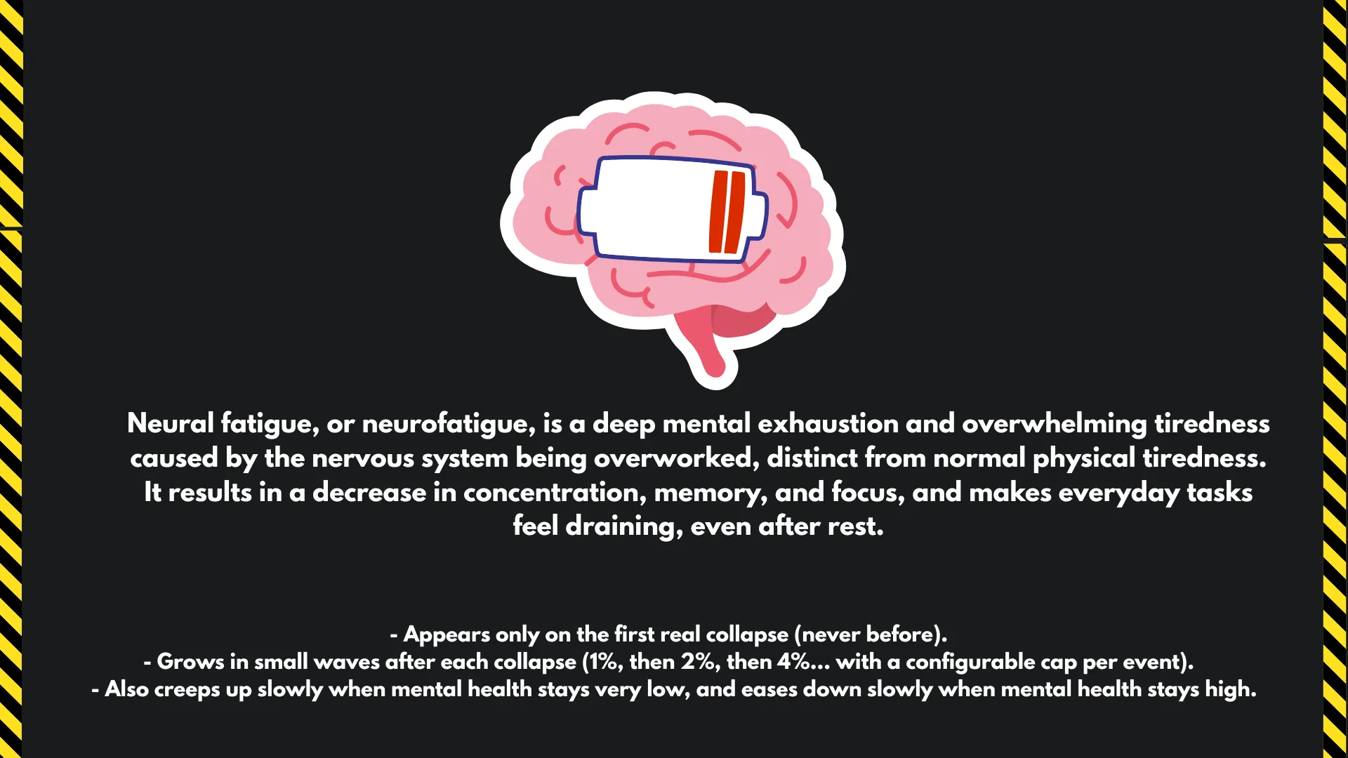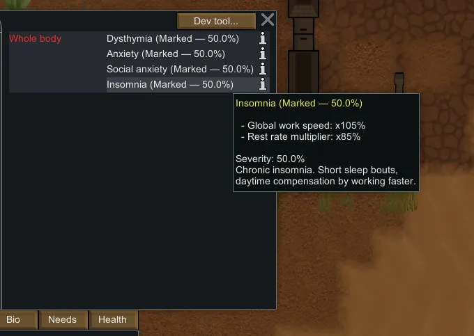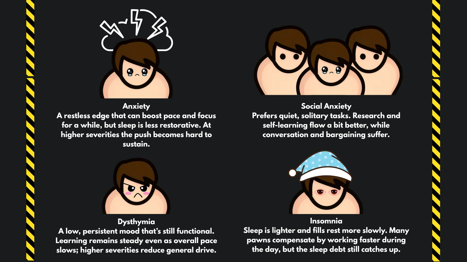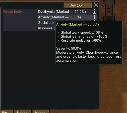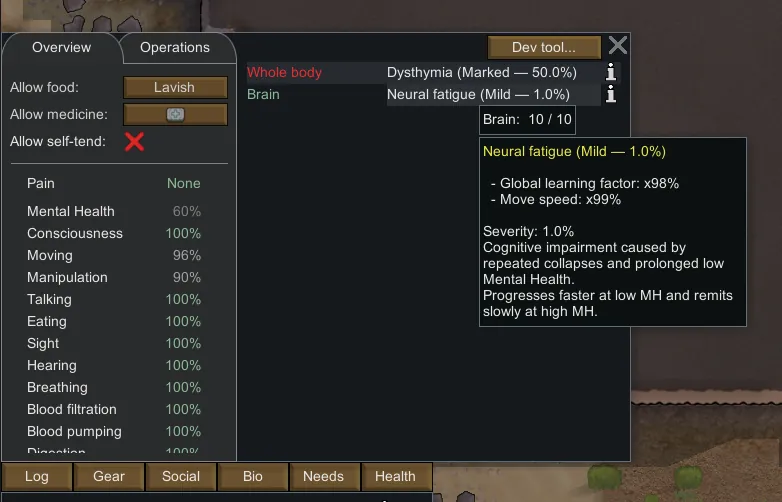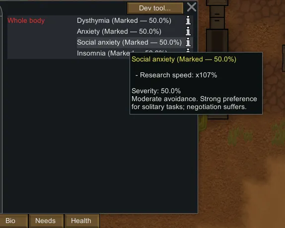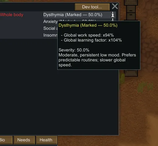 Each disorder starts at [b]50% severity[/b] and only progresses while MH is genuinely low ([b]0–20%[/b]). There’s a friendly “safety lock” that prevents stacking too fast; it unlocks after spending sustained time in that low range. Remission slowly happens at high MH.