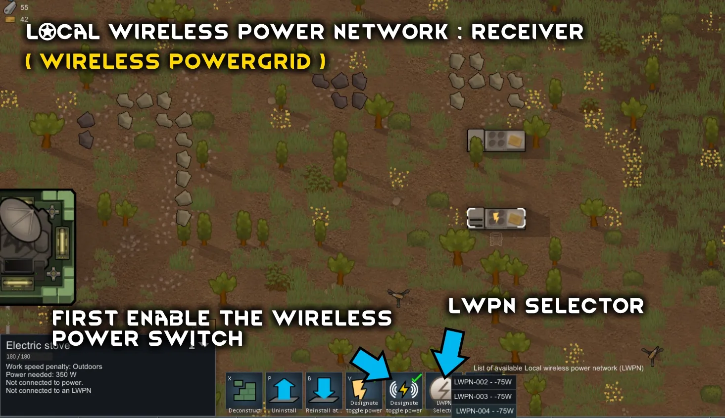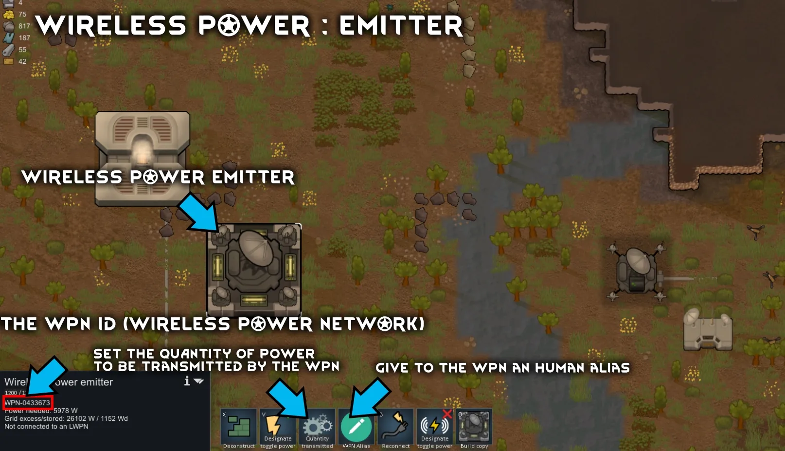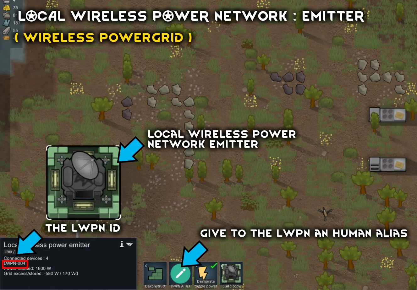 [*] 1) You build an emitter who will emit (on the current map only) automatically the connected power network wirelessly, it is the LWPN (Local Wireless Power Network eg : LWPN-001).