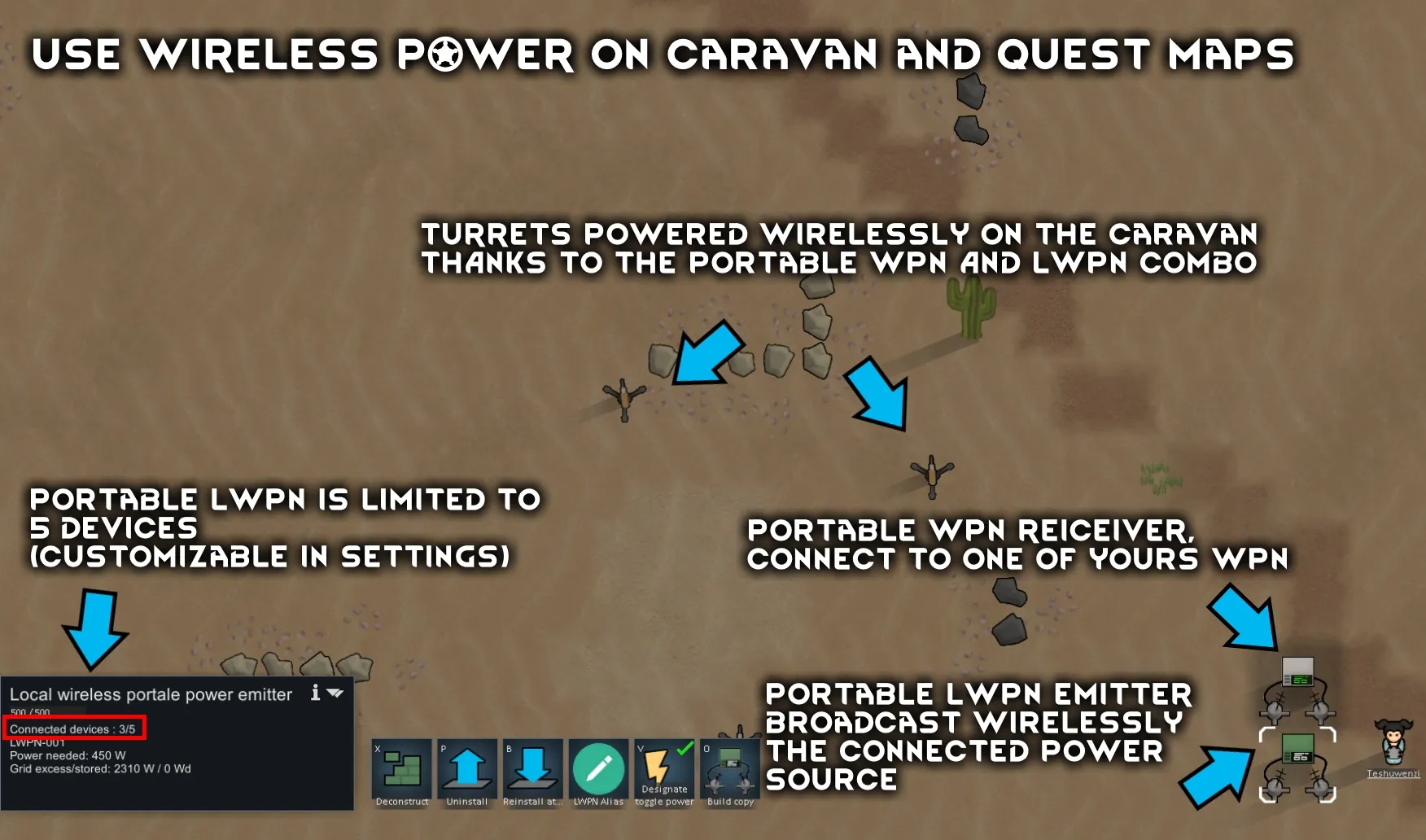 [*] Use turrets and other electric defenses systems on caravan and quest maps thanks to portable (but limited) WPN Receptor and portable LWPN Emitter