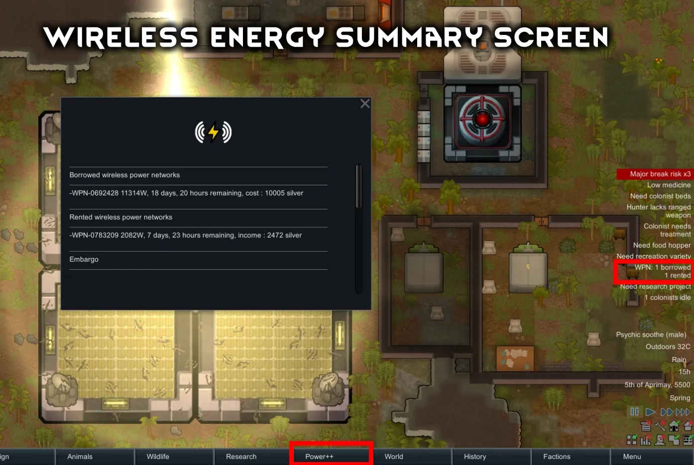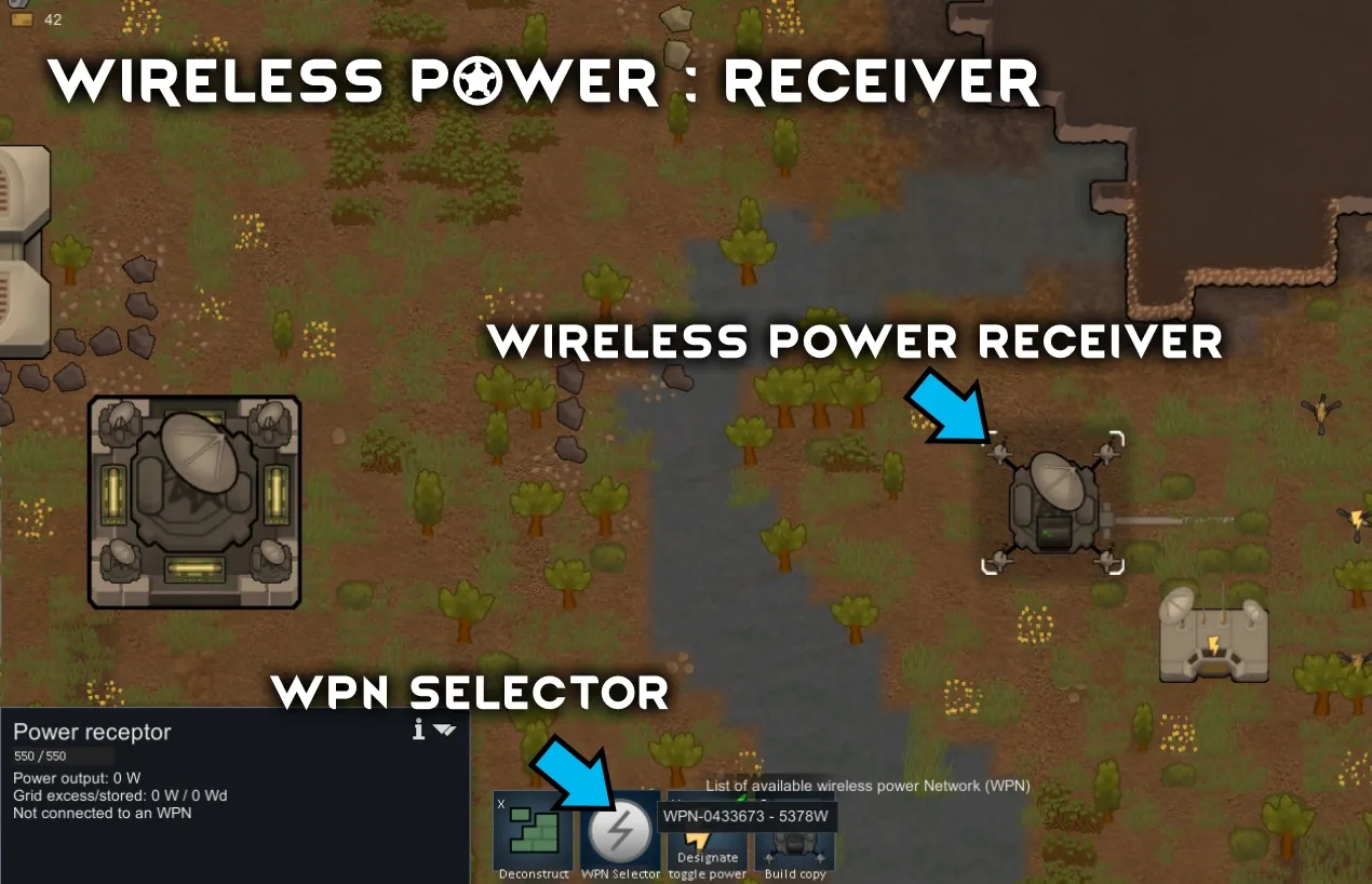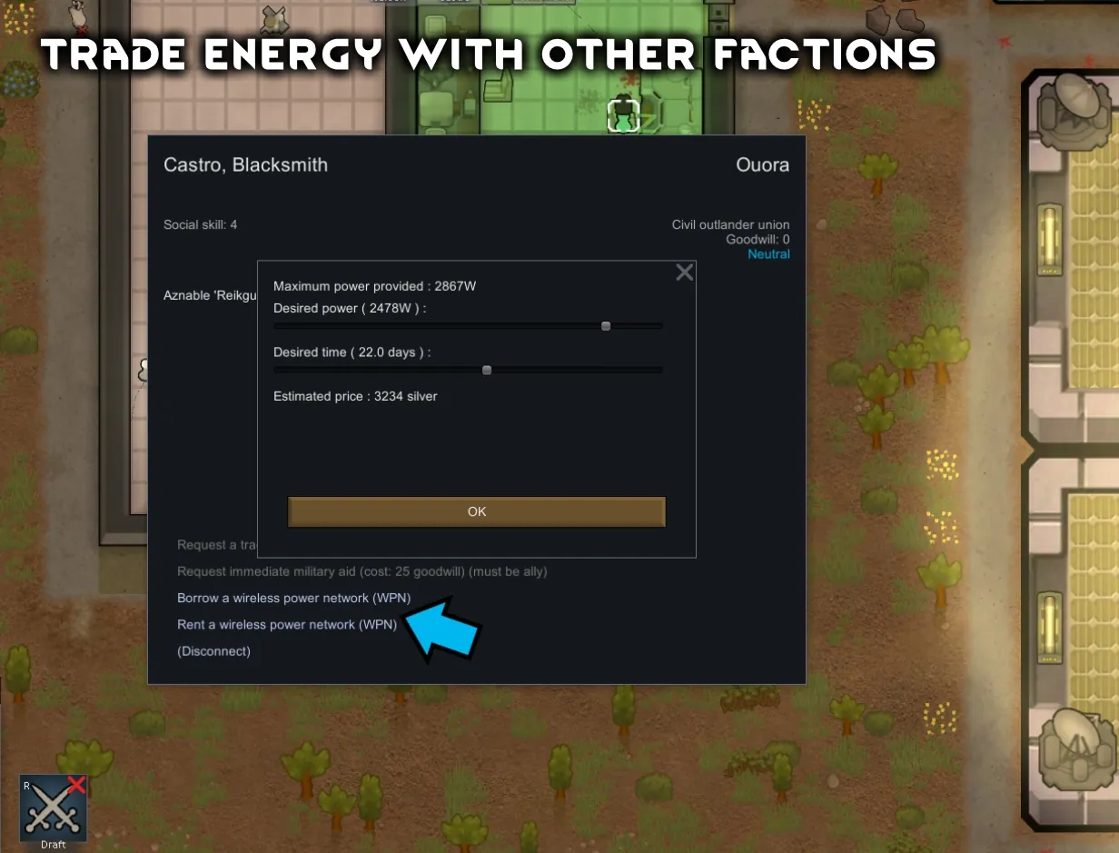 Trade power (buy and sell) with factions, share wirelessly power between your colonies and all other maps (caravan, quest, [url=https://www.youtube.com/watch?v=OMzX5jMZQZI]deeprim[/url]...), connect electrical devices to wireless powergrids (no cables), thanks to the [b]wireless power network technologies research[/b].