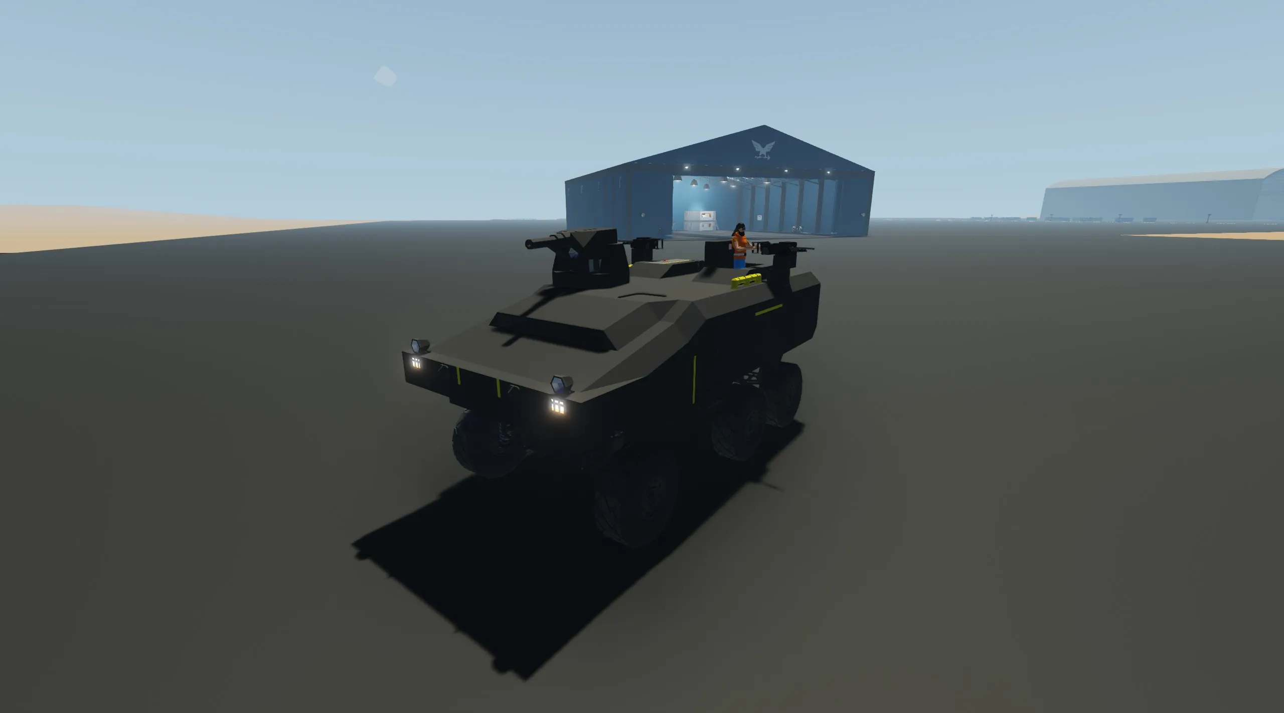 drives well, has the roof auto cannon that has the same ammo as the mobile refinery (100rds) and 2 stalwart(machine gun) turrets with 4 spare mags. the roof auto cannon is camera aimed and the 2 side turrets are aimed with keyboard that is that controls I found best for each gun, this can do pvp but is mostly for show