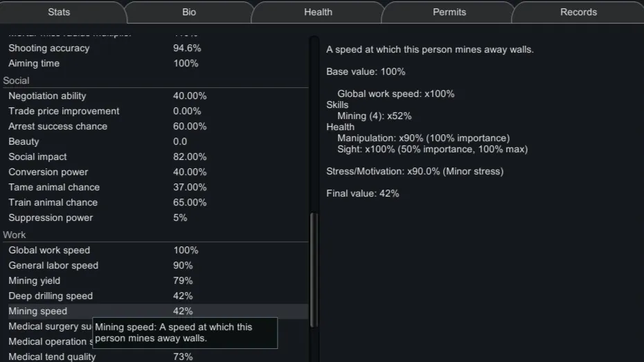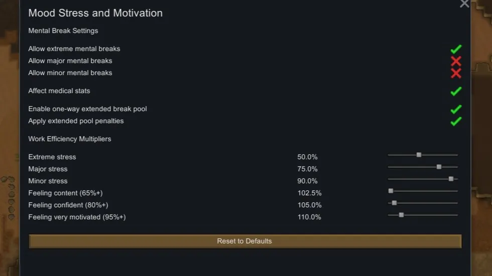 This mod adds new mechanic to the game. Mood directly affects pawn's working efficiency. Out of the box mod turns off Minor and Major mental breaks. leaving only extreme breaks being able to happen. In settings you can turn on and off all types of breaks individually. That means you could play without any Mental breaks at all and balance the game only via working efficiency debuffs(debuff multipliers are configurable in settings too.) Mood affects all "Statdefof"s except WorkSpeedGlobal and GeneralLaborSpeed so the mood/debuff logic doesn't apply on some stats twice.(I basically made everything in a way that it works in a logical way like reversing the mod logic for "chance to poison food" and etc.)