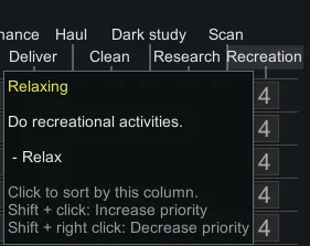 If a pawn is prioritized for this work type, they do recreation just like they do in vanilla. The difference is that they won’t stop even when their recreation need reaches 100%.